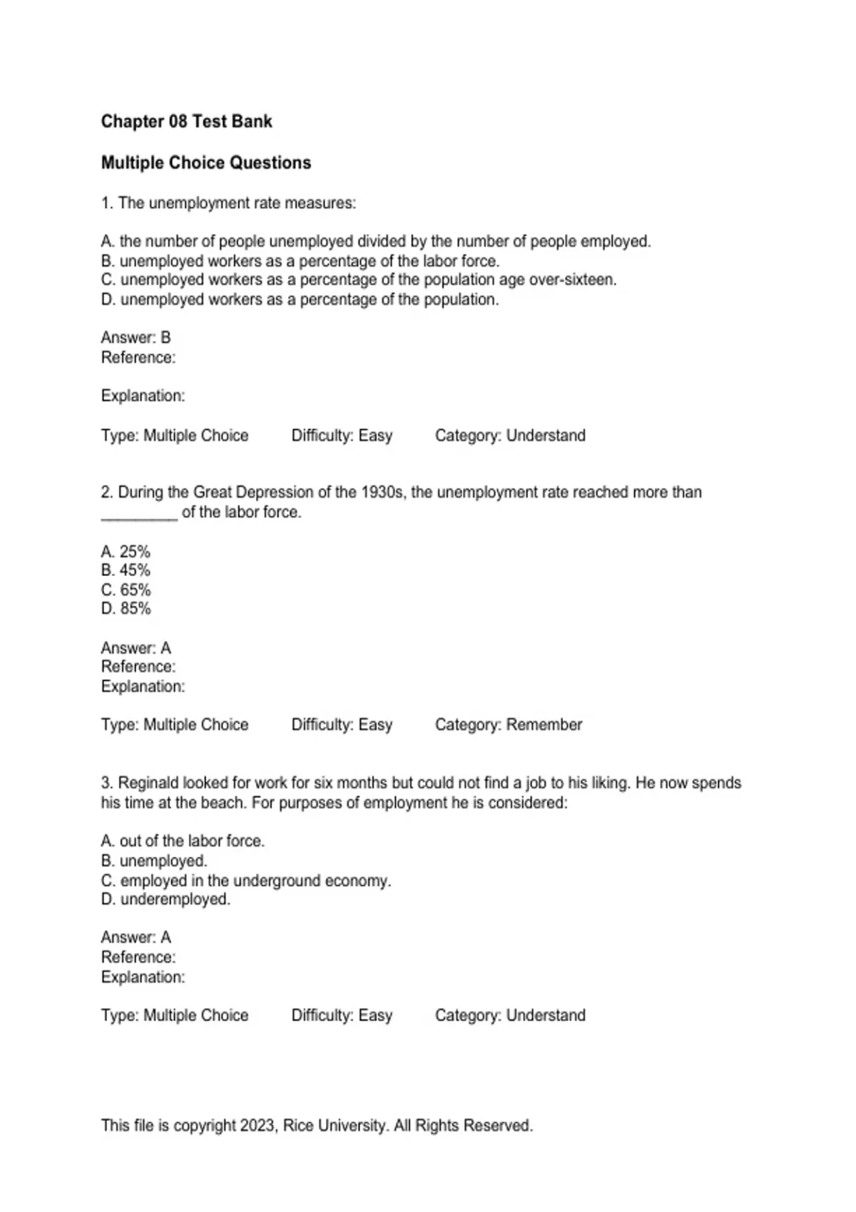 Updated Macroeconomics 3rd Edition Test Bank Chapter 8 Unemployment with solution, featuring comprehensive multiple-choice questions, detailed explanations, and accurate answers covering types of unemployment, labor force dynamics, natural rate of unemployment, and policy responses. This 2025/ 2026 edition helps students strengthen macroeconomic analysis, understand real-world labor market issues, and improve overall exam performance.