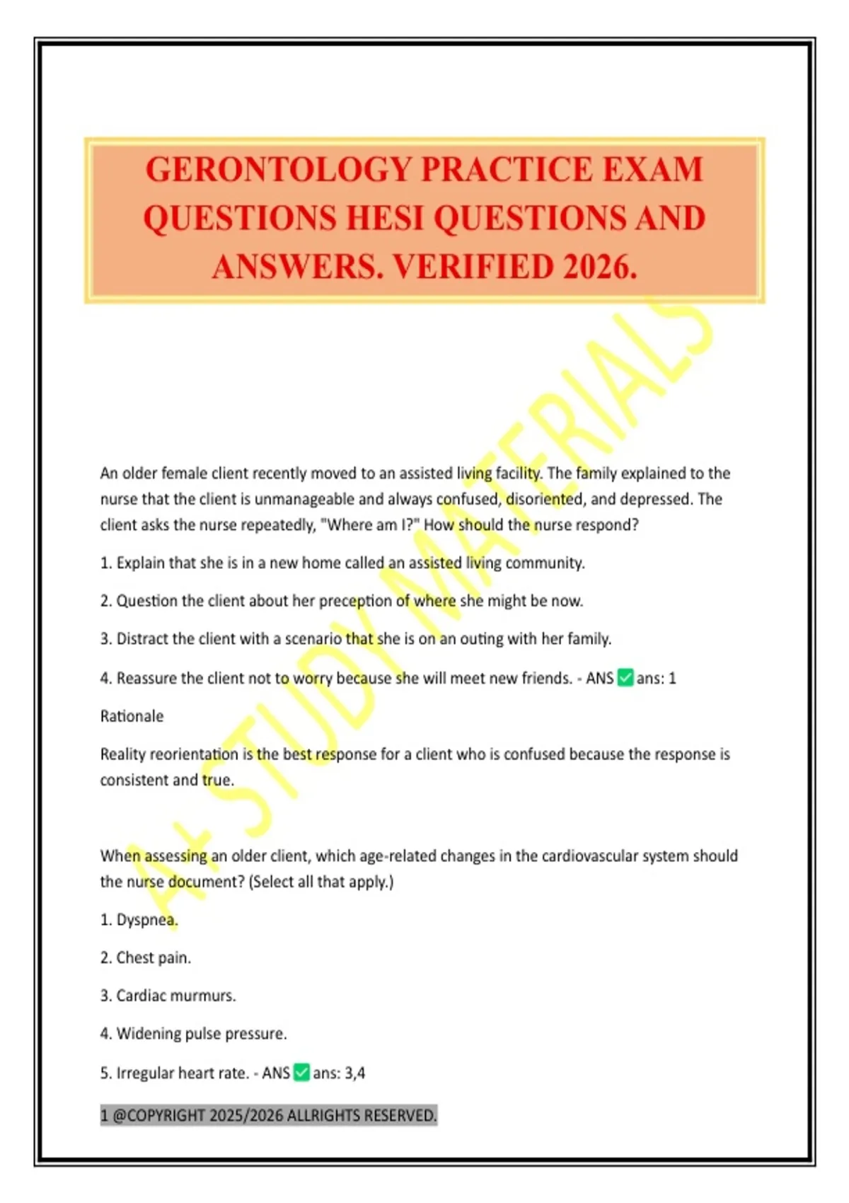 GERONTOLOGY PRACTICE EXAM QUESTIONS HESI QUESTIONS AND ANSWERS. VERIFIED 2026.