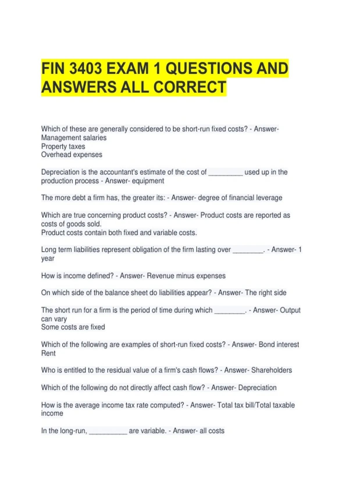 FIN 3403 EXAM 1 QUESTIONS AND ANSWERS ALL CORRECT