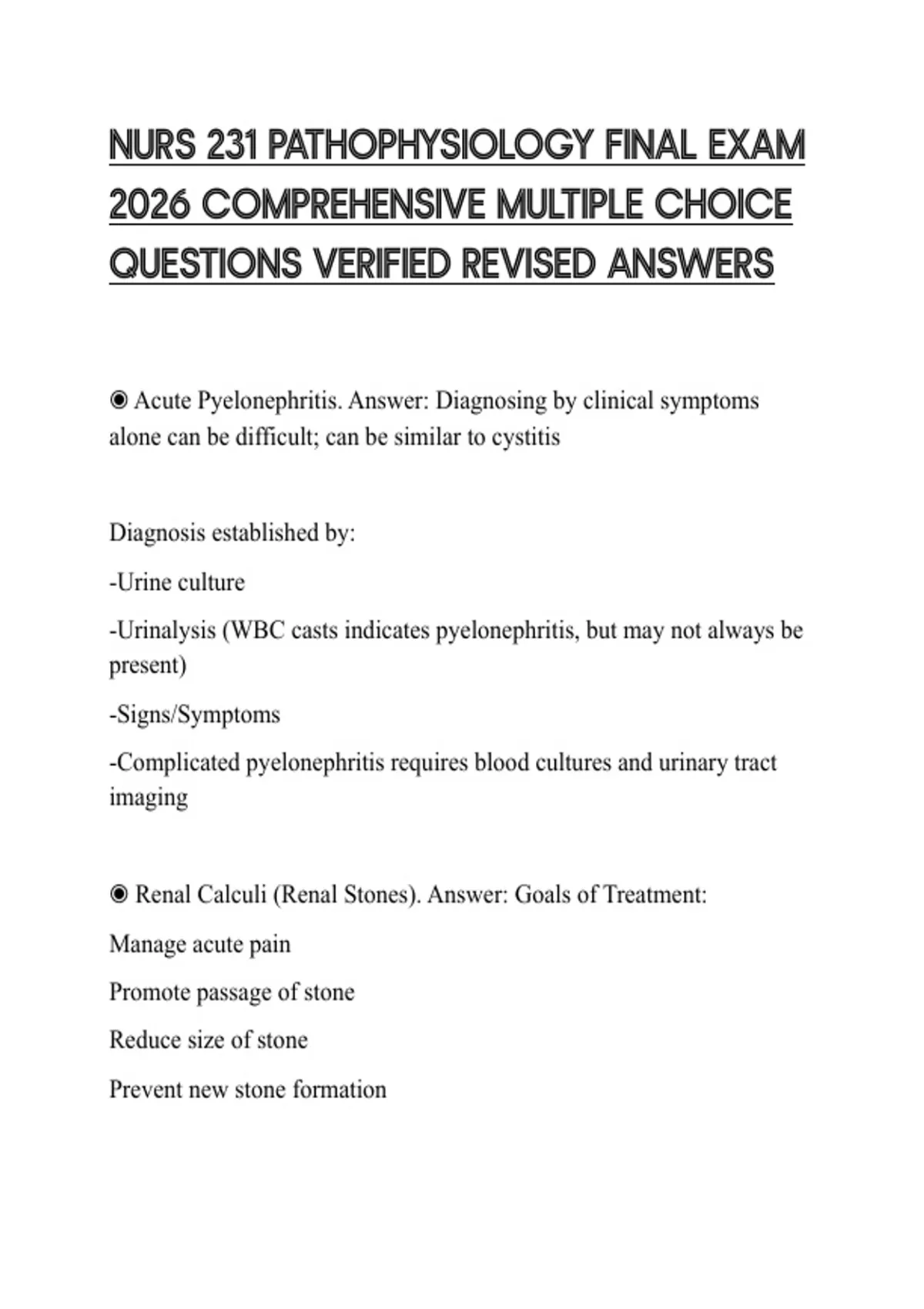 ◉ Renal Calculi (Renal Stones). Answer: Goals of Treatment: