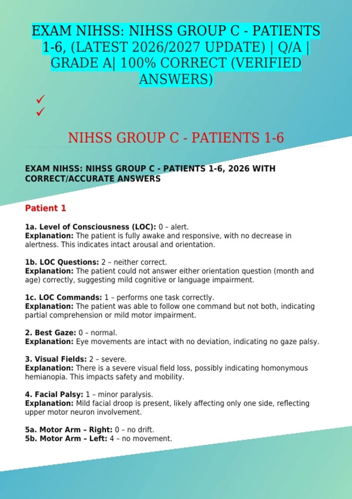 EXAM NIHSS: NIHSS GROUP C - PATIENTS 1-6, (LATEST 2026/2027 UPDATE) | Q/A | GRADE A| 100% CORRECT (VERIFIED ANSWERS)