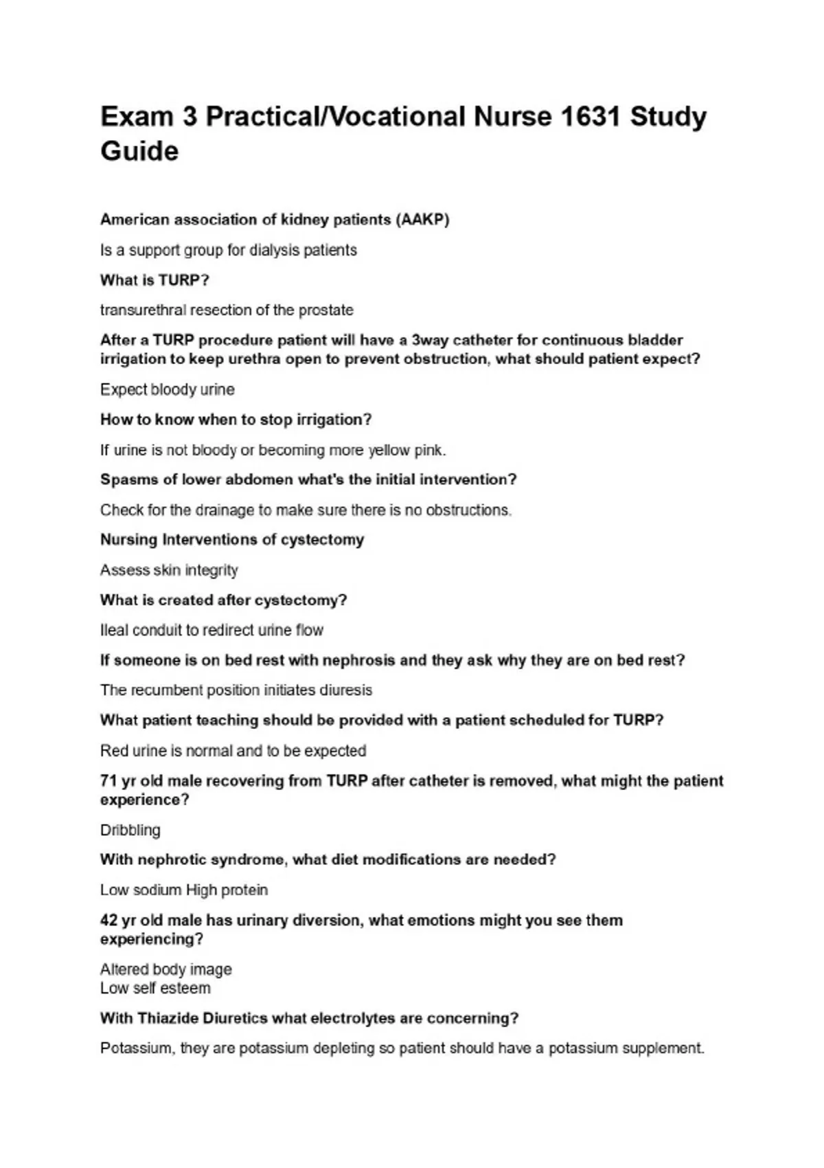 Exam 3 Practical/Vocational Nurse 1631 Study Guide American association of kidney patients (AAKP) Is a support group for dialysis patients What is TURP? transurethral resection of the prostate After a TURP procedure patient will have a 3way catheter for continuous bladder irrigation to keep urethra open to prevent obstruction, what should patient expect? Expect bloody urine How to know when to stop irrigation? If urine is not bloody or becoming more yellow pink. Spasms of lower abdomen what's the initial intervention? Check for the drainage to make sure there is no obstructions. Nursing Interventions of cystectomy Assess skin integrity What is created after cystectomy? Ileal conduit to redirect urine flow If someone is on bed rest with nephrosis and they ask why they are on bed rest? The recumbent position initiates diuresis What patient teaching should be provided with a patient scheduled for TURP? Red urine is normal and to be expected 71 yr old male recovering from TURP after catheter is removed, what might the patient experience? Dribbling With nephrotic syndrome, what diet modifications are needed? Low sodium High protein 42 yr old male has urinary diversion, what emotions might you see them experiencing? Altered body image Low self esteem With Thiazide Diuretics what electrolytes are concerning? Potassium, they are potassium depleting so patient should have a potassium supplement.