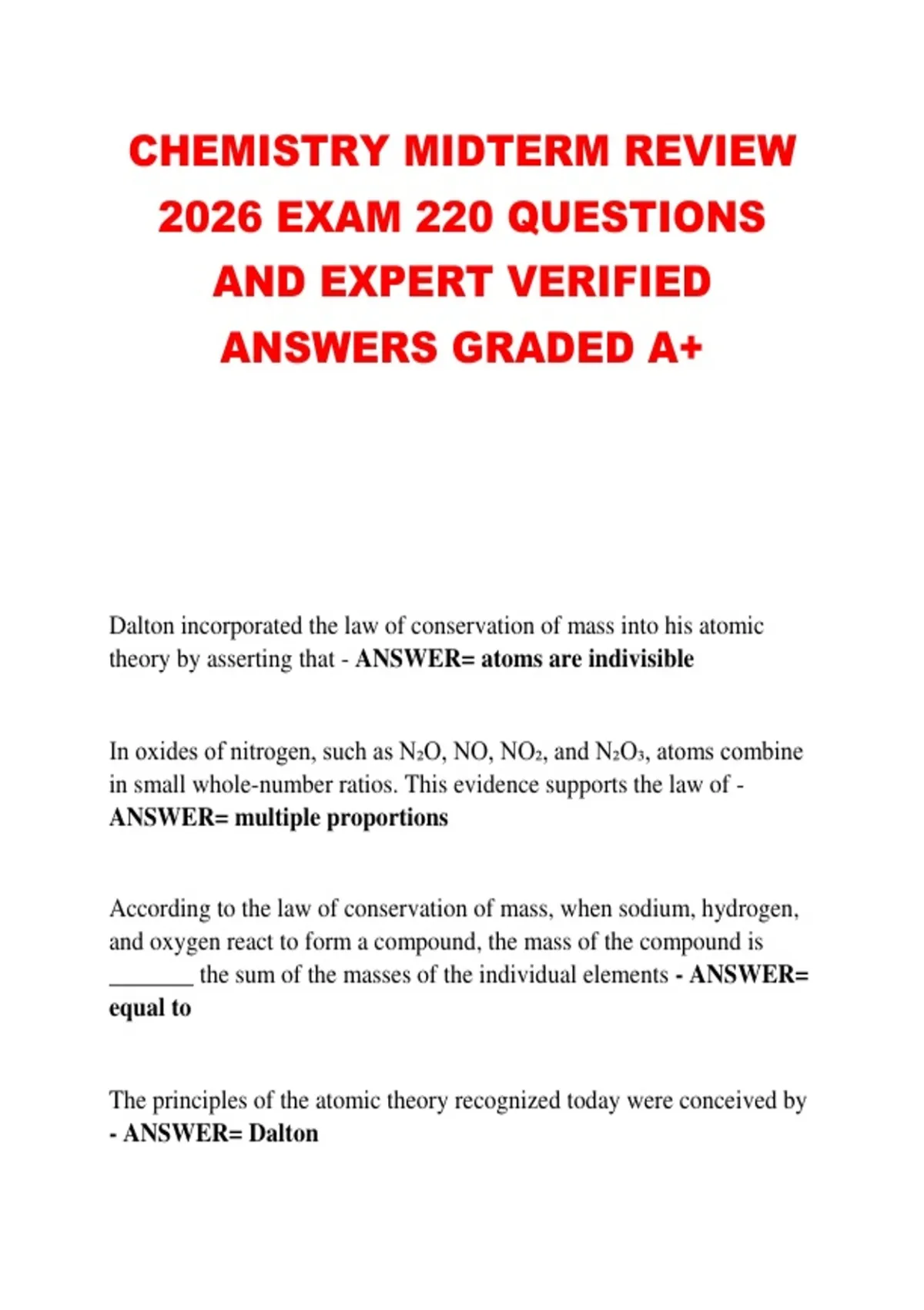 CHEMISTRY MIDTERM REVIEW 2026 EXAM 220 QUESTIONS AND EXPERT VERIFIED ANSWERS GRADED A+CHEMISTRY MIDTERM REVIEW 2026 EXAM 220 QUESTIONS AND EXPERT VERIFIED ANSWERS GRADED A+CHEMISTRY MIDTERM REVIEW 2026 EXAM 220 QUESTIONS AND EXPERT VERIFIED ANSWERS GRADED A+