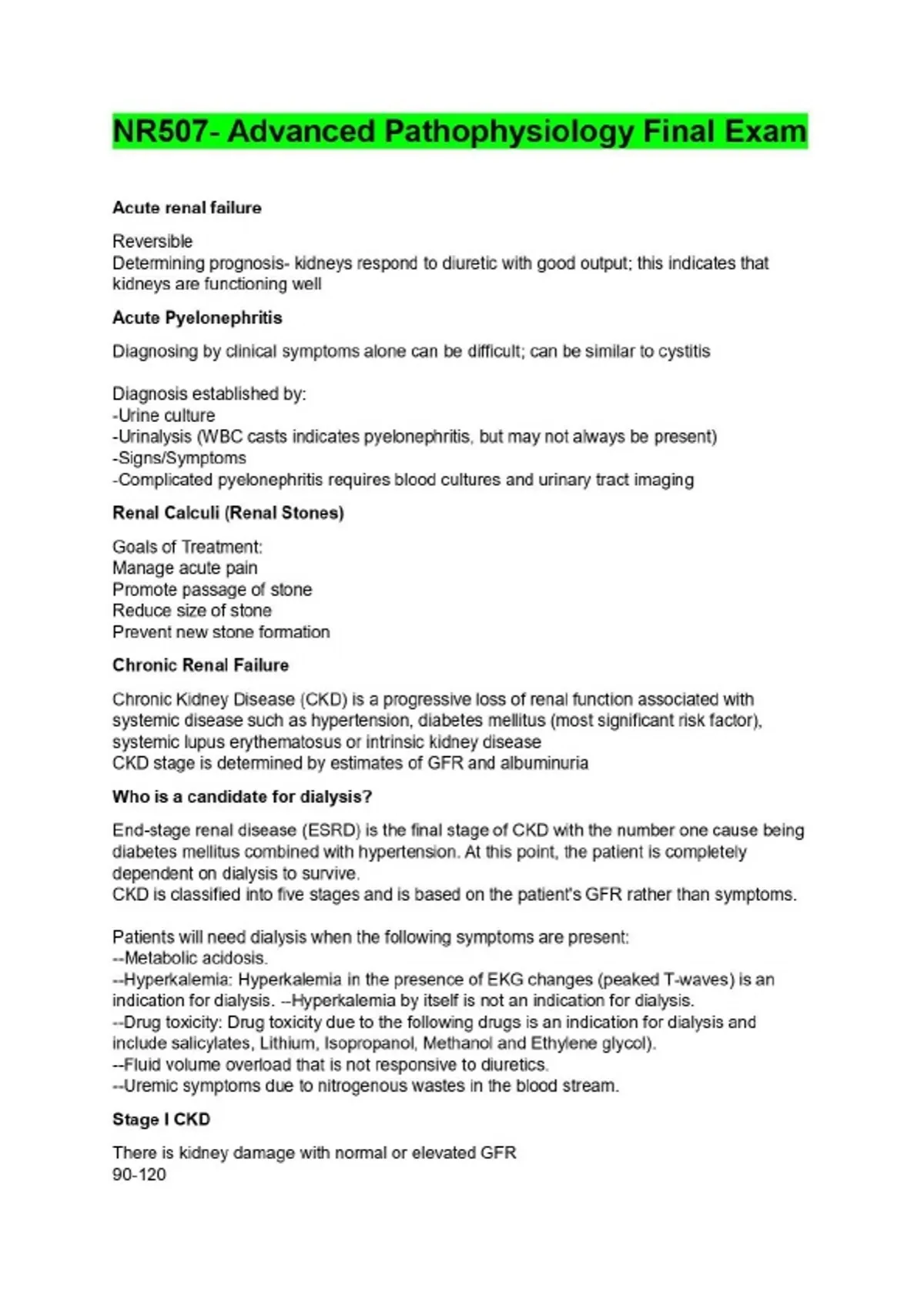 Acute renal failure Reversible Determining prognosis- kidneys respond to diuretic with good output; this indicates that kidneys are functioning well Acute Pyelonephritis Diagnosing by clinical symptoms alone can be difficult; can be similar to cystitis Diagnosis established by: -Urine culture -Urinalysis (WBC casts indicates pyelonephritis, but may not always be present) -Signs/Symptoms -Complicated pyelonephritis requires blood cultures and urinary tract imaging Renal Calculi (Renal Stones) Goals of Treatment: Manage acute pain Promote passage of stone Reduce size of stone Prevent new stone formation Chronic Renal Failure Chronic Kidney Disease (CKD) is a progressive loss of renal function associated with systemic disease such as hypertension, diabetes mellitus (most significant risk factor), systemic lupus erythematosus or intrinsic kidney disease CKD stage is determined by estimates of GFR and albuminuria Who is a candidate for dialysis? End-stage renal disease (ESRD) is the final stage of CKD with the number one cause being diabetes mellitus combined with hypertension. At this point, the patient is completely dependent on dialysis to survive. CKD is classified into five stages and is based on the patient's GFR rather than symptoms. Patients will need dialysis when the following symptoms are present: --Metabolic acidosis. --Hyperkalemia: Hyperkalemia in the presence of EKG changes (peaked T-waves) is an indication for dialysis. --Hyperkalemia by itself is not an indication for dialysis. --Drug toxicity: Drug toxicity due to the following drugs is an indication for dialysis and include salicylates, Lithium, Isopropanol, Methanol and Ethylene glycol). --Fluid volume overload that is not responsive to diuretics. --Uremic symptoms due to nitrogenous wastes in the blood stream. Stage I CKD There is kidney damage with normal or elevated GFR 90-120