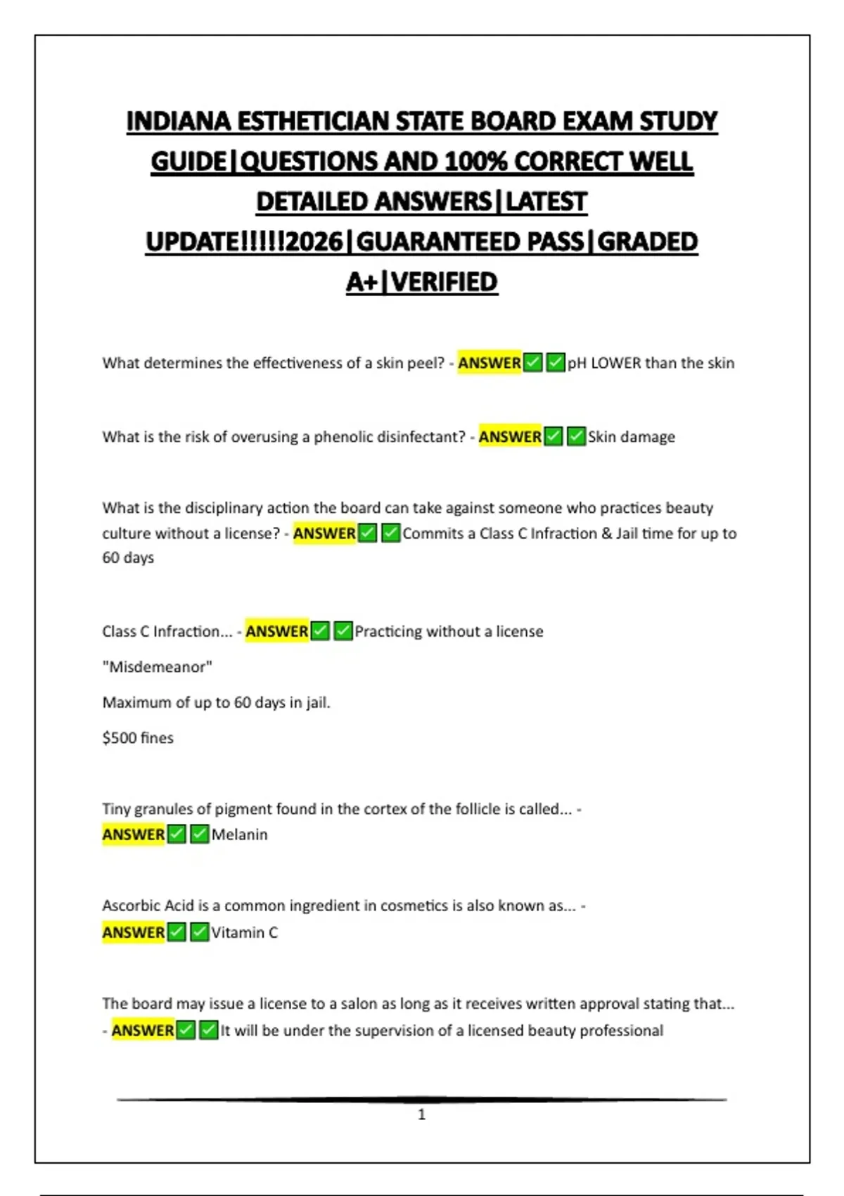 INDIANA ESTHETICIAN STATE BOARD EXAM STUDY GUIDE|QUESTIONS AND 100% CORRECT WELL DETAILED ANSWERS|LATEST UPDATE!!!!!2026|GUARANTEED PASS|GRADED A+|VERIFIED