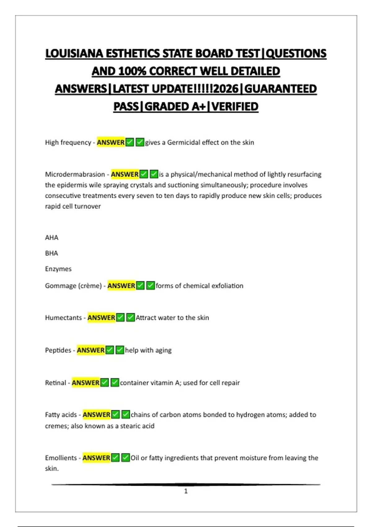 LOUISIANA ESTHETICS STATE BOARD TEST|QUESTIONS AND 100% CORRECT WELL DETAILED ANSWERS|LATEST UPDATE!!!!!2026|GUARANTEED PASS|GRADED A+|VERIFIED