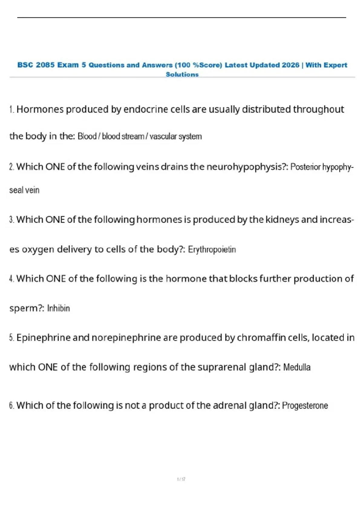BSC 2085 Exam 5 Questions and Answers (100 %Score) Latest Updated 2026 | With Expert Solutions