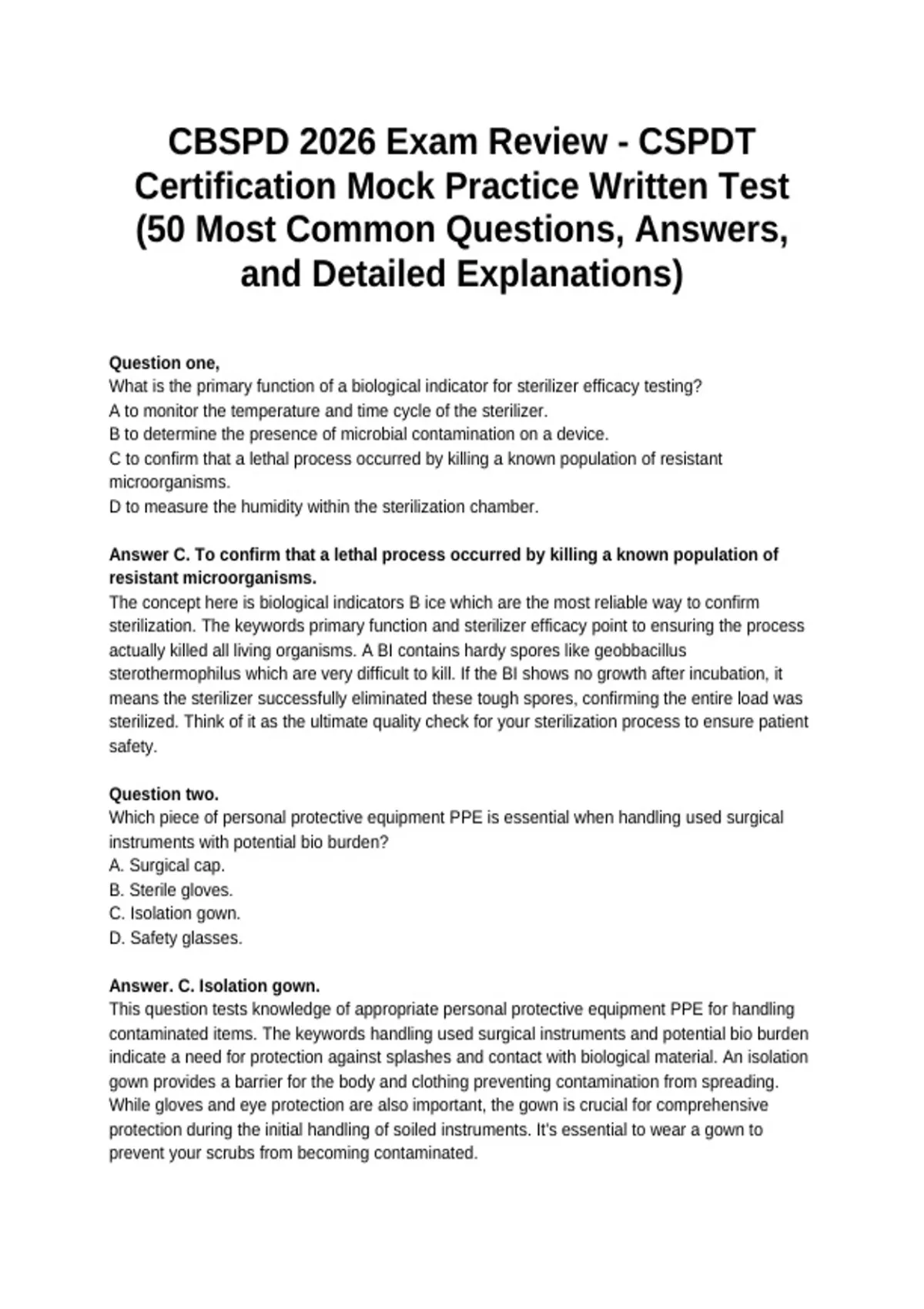 This exam review contains 50 of the most common CBSPD CSPDT certification questions with accurate answers and detailed explanations to support effective exam preparation. It focuses on core sterile processing topics including infection control, decontamination, instrumentation, sterilization methods, and regulatory standards, making it ideal for mock testing and final review.