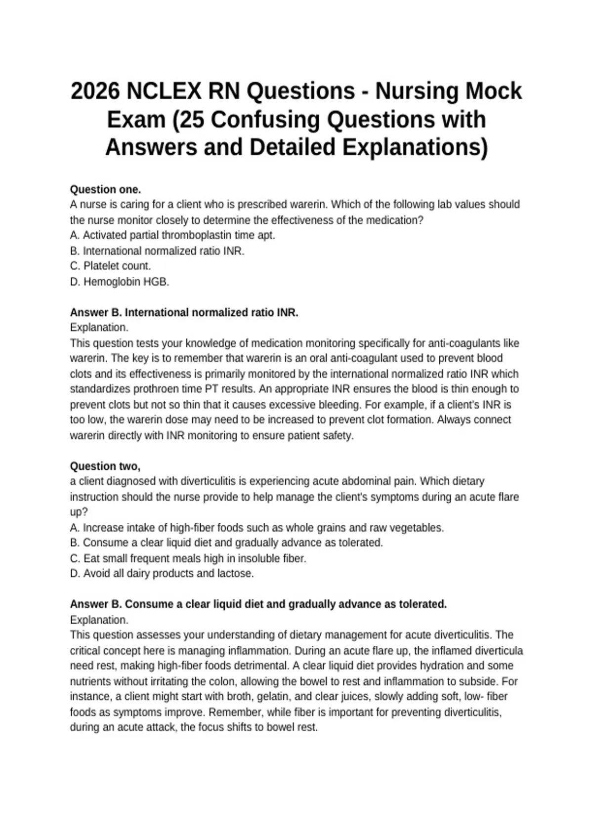 This document features 25 carefully selected 2026 NCLEX-RN MOCK questions designed to challenge critical thinking and clarify commonly confusing nursing concepts. Each question includes the correct answer and a detailed explanation, covering key NCLEX areas such as clinical judgment, prioritization, patient safety, pharmacology, and nursing interventions.