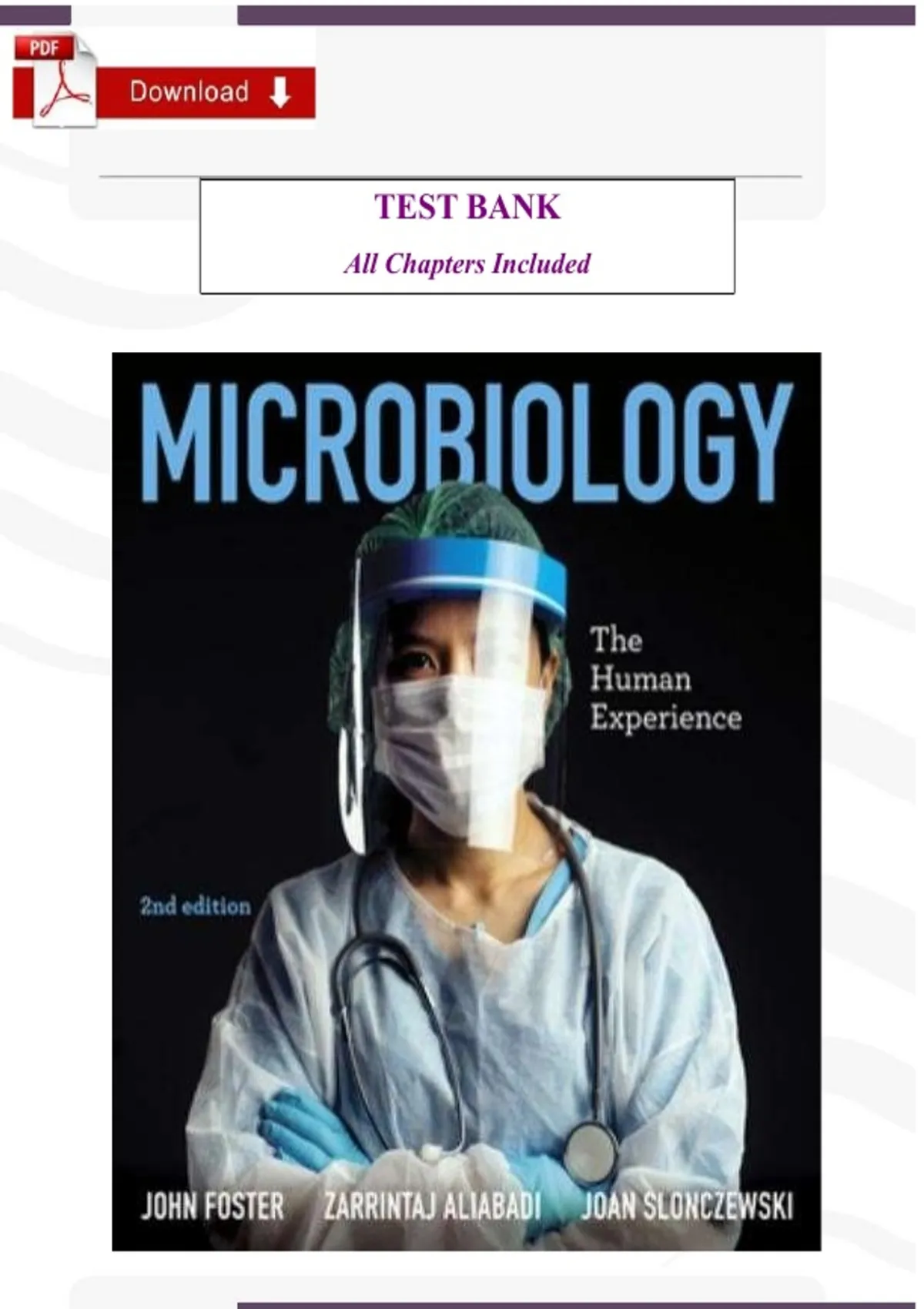 This document contains a complete test bank for Microbiology: The Human Experience (First Edition) by John W. Foster. It includes exam-style questions covering fundamental microbiology topics such as microbial structure and function, metabolism, genetics, immunity, pathogens, infectious diseases, and the role of microbiology in human health. The test bank is suitable for exam preparation, practice, and reinforcement of key concepts commonly taught in undergraduate microbiology and health science courses.