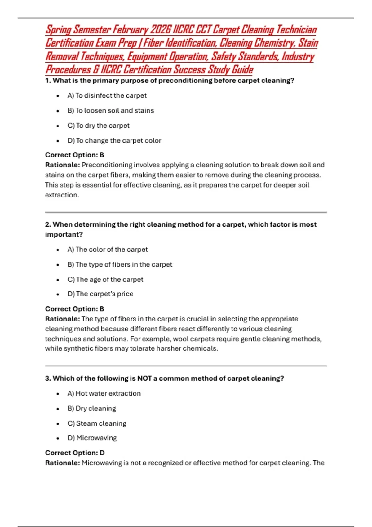 Spring Semester February 2026 IICRC CCT Carpet Cleaning Technician Certification Exam Prep | Fiber Identification, Cleaning Chemistry, Stain Removal Techniques, Equipment Operation, Safety Standards, Industry Procedures & IICRC Certification Success Study