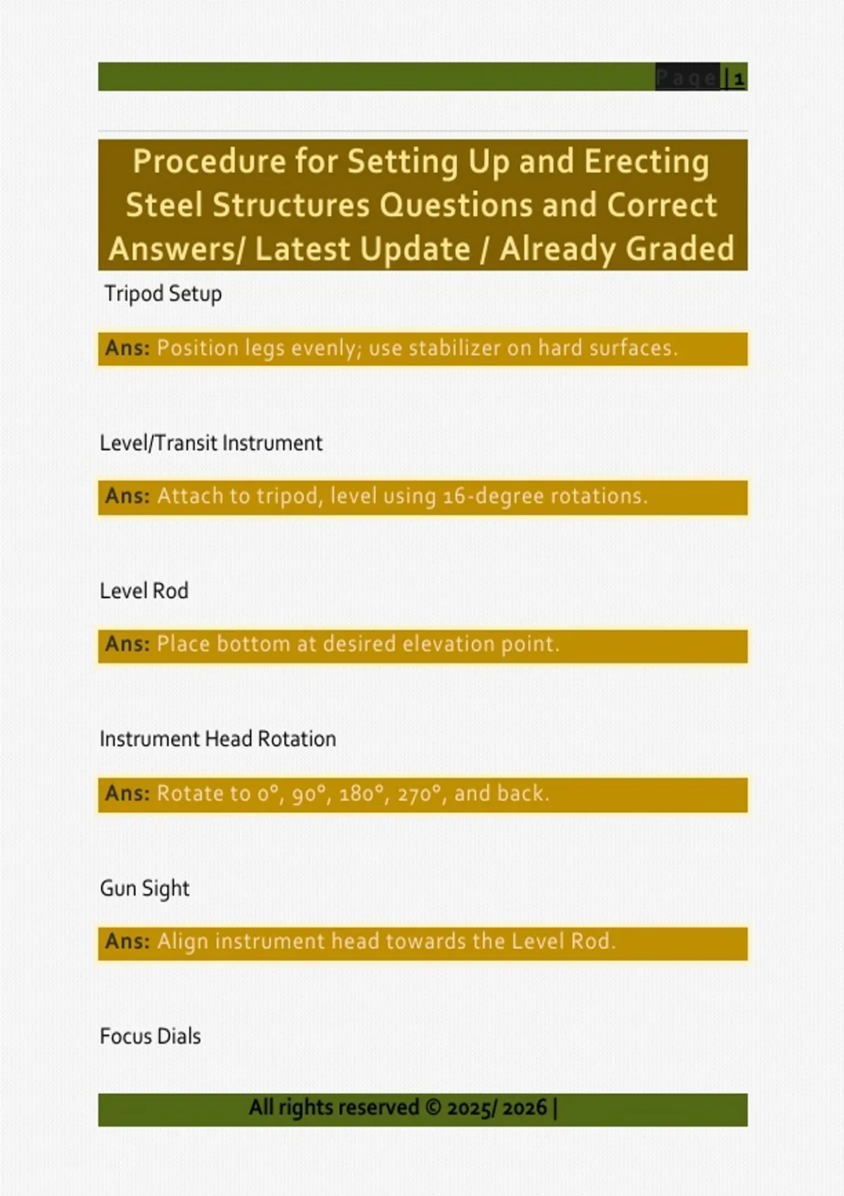 Tripod Setup Ans: Position legs evenly; use stabilizer on hard surfaces. Level/Transit Instrument Ans: Attach to tripod, level using 16-degree rotations. Level Rod Ans: Place bottom at desired elevation point. Instrument Head Rotation Ans: Rotate to 0°, 90°, 180°, 270°, and back. Gun Sight Ans: Align instrument head towards the Level Rod. Focus Dials