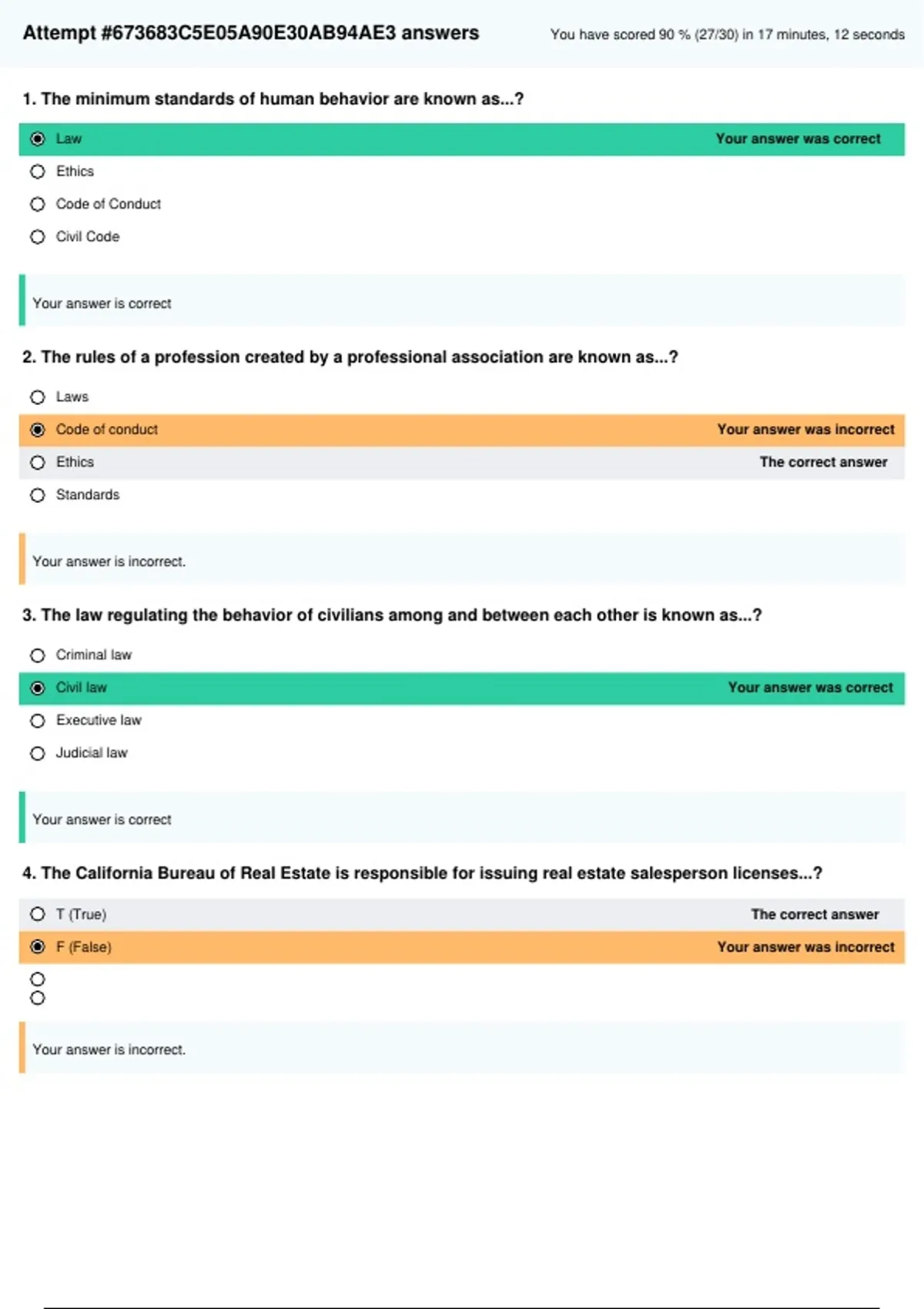 Attempt #673683C5E05A90E30AB94AE3 answers You have scored 90 % (27/30) in 17 minutes, 12 seconds