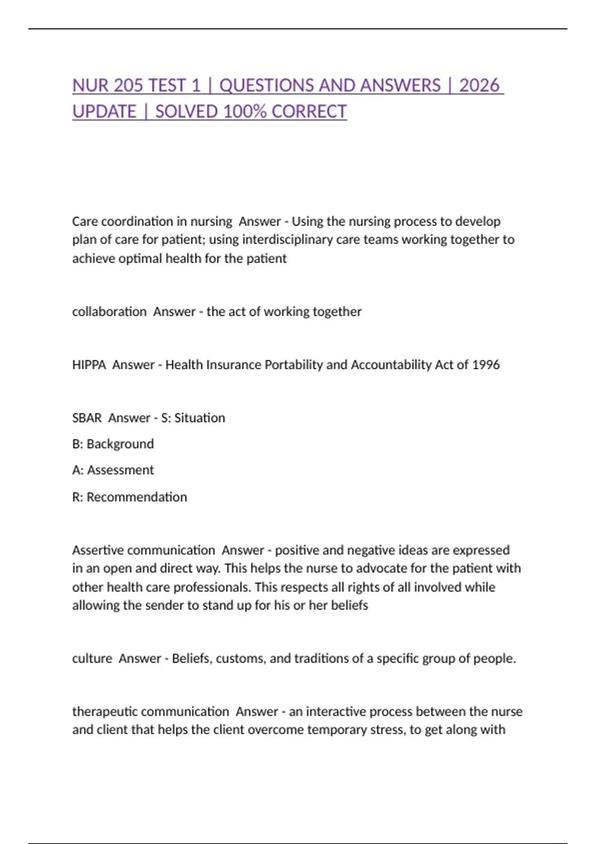 NUR 205 TEST 1 | QUESTIONS AND ANSWERS | 2026 UPDATE | SOLVED 100% CORRECT