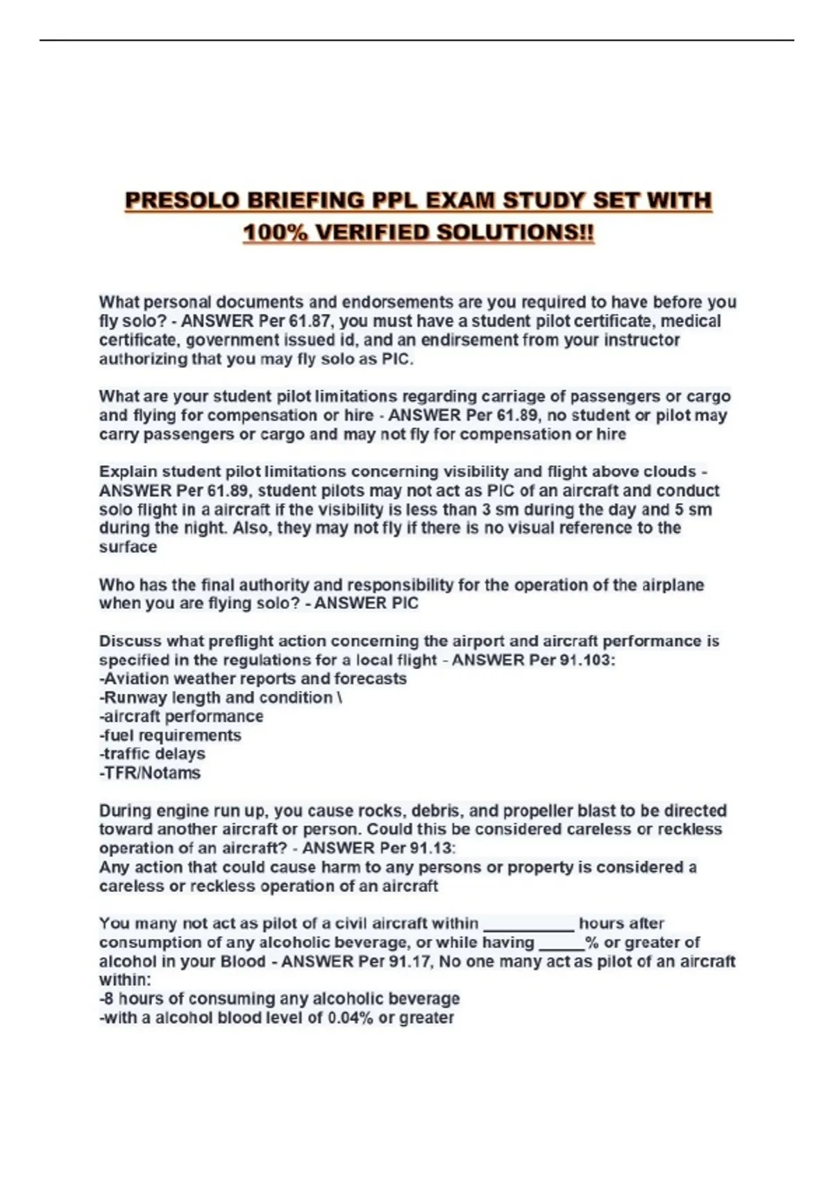 PRESOLO BRIEFING PPL EXAM STUDY SET WITH 100% VERIFIED SOLUTIONS!!...