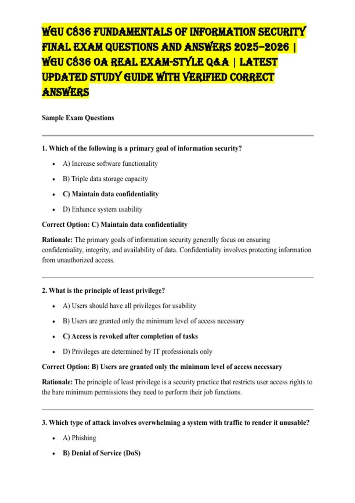 This expertly curated WGU C836 Fundamentals of Information Security Questions and Answers study guide is designed to help Western Governors University students pass the C836 Objective Assessment (OA) with confidence. The document includes real exam-style questions with verified correct answers, fully aligned with the latest WGU C836 course competencies and exam structure. It covers high-yield topics such as risk management, access control, cryptography, network security, security policies, incident response, and compliance frameworks. Ideal for fast-paced WGU learners, this resource eliminates unnecessary reading, sharpens exam readiness, and reinforces critical security concepts in a clear, practical format. Whether you’re reviewing before the OA or strengthening weak areas, this up-to-date guide provides a time-saving, reliable, and results-driven approach to successfully completing WGU C836.