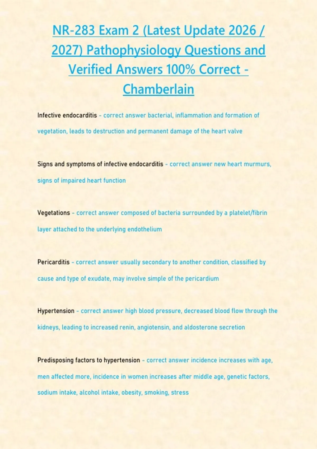 NR-283 Exam 2 (Latest Update ) Pathophysiology Questions and Verified Answers 100-CORRECT - CHAMBERLAIN