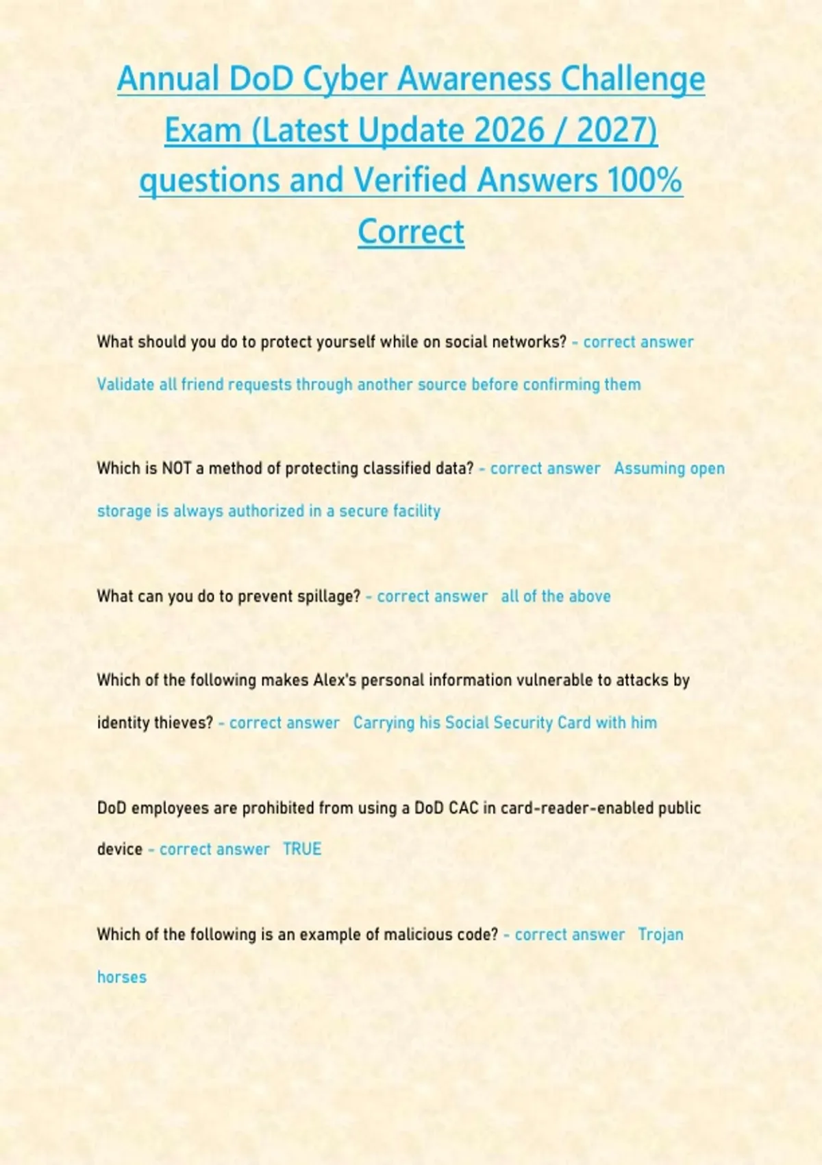 Annual DoD Cyber Awareness Challenge Exam (Latest Update ) questions and Verified Answers