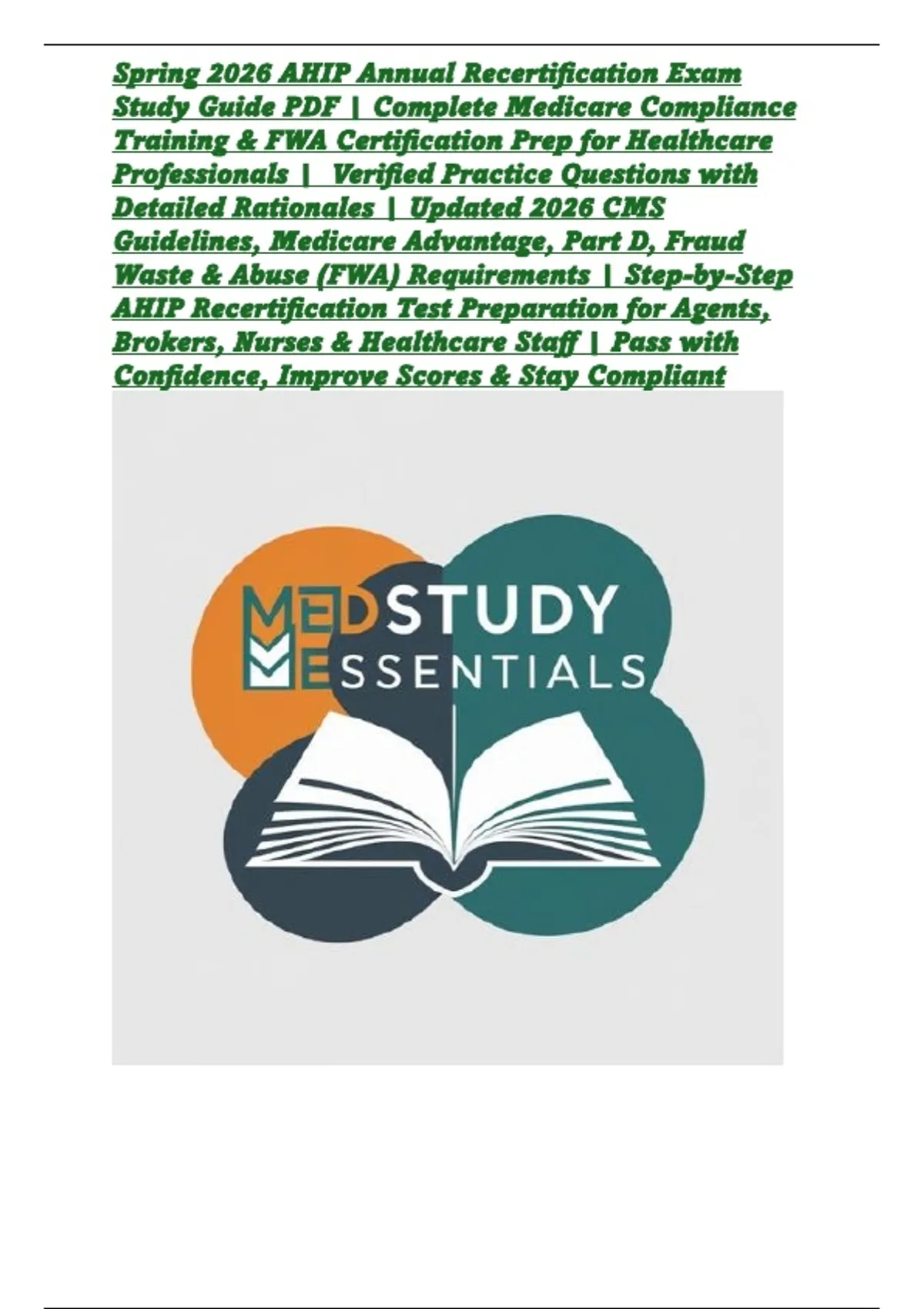 Stay fully compliant and confidently pass your Spring 2026 AHIP Annual Recertification Exam with this complete, up-to-date study guide tailored for healthcare professionals, insurance agents, brokers, and medical staff. This resource includes 350+ verified practice questions with detailed rationales designed to strengthen understanding of Medicare Advantage, Part D plans, CMS regulations, and Fraud, Waste & Abuse (FWA) requirements. Carefully aligned with 2026 AHIP and CMS updates, the guide simplifies complex compliance rules into exam-focused practice and real-world scenarios, helping you retain information faster and avoid common mistakes. Whether you are renewing your certification or ensuring organizational compliance, this all-in-one PDF practice resource boosts confidence, sharpens test performance, and helps you complete AHIP recertification quickly and successfully.