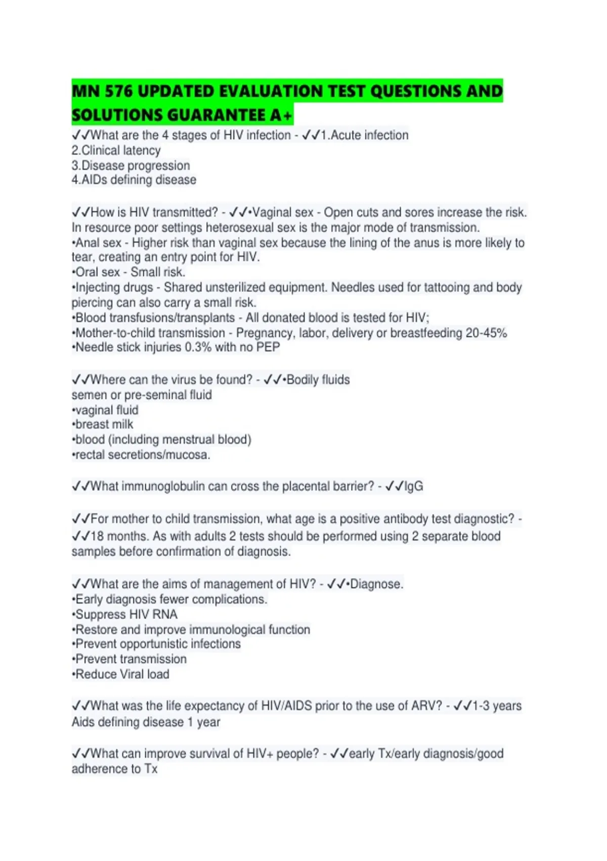 ✔✔What are the 4 stages of HIV infection - ✔✔1.Acute infection