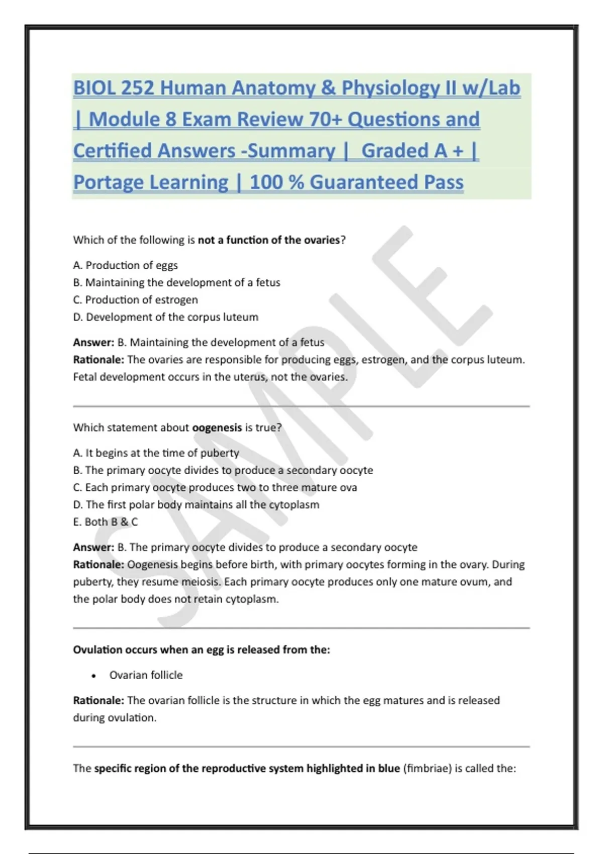 Rationale: Oogenesis begins before birth, with primary oocytes forming in the ovary. During