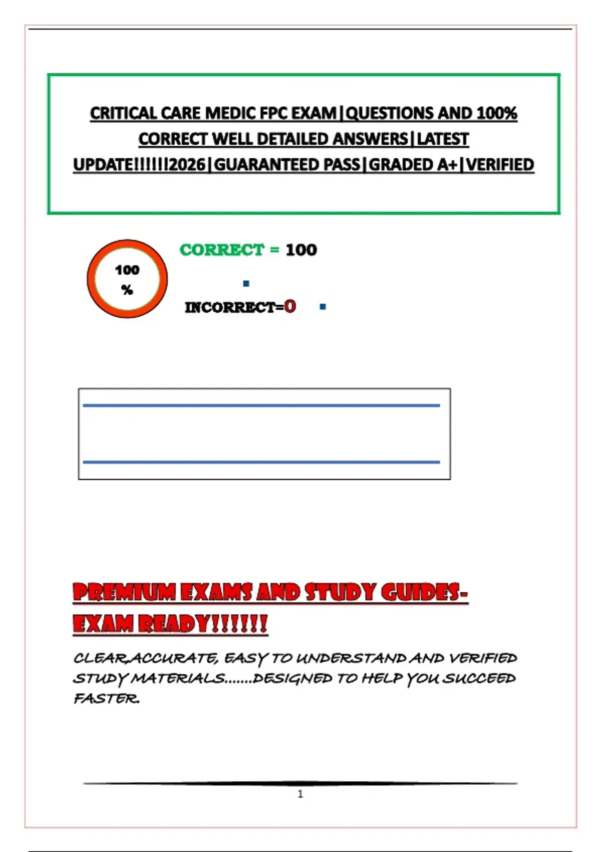 CRITICAL CARE MEDIC FPC EXAM|QUESTIONS AND 100% CORRECT WELL DETAILED ANSWERS|LATEST UPDATE!!!!!!2026|GUARANTEED PASS|GRADED A+|VERIFIED