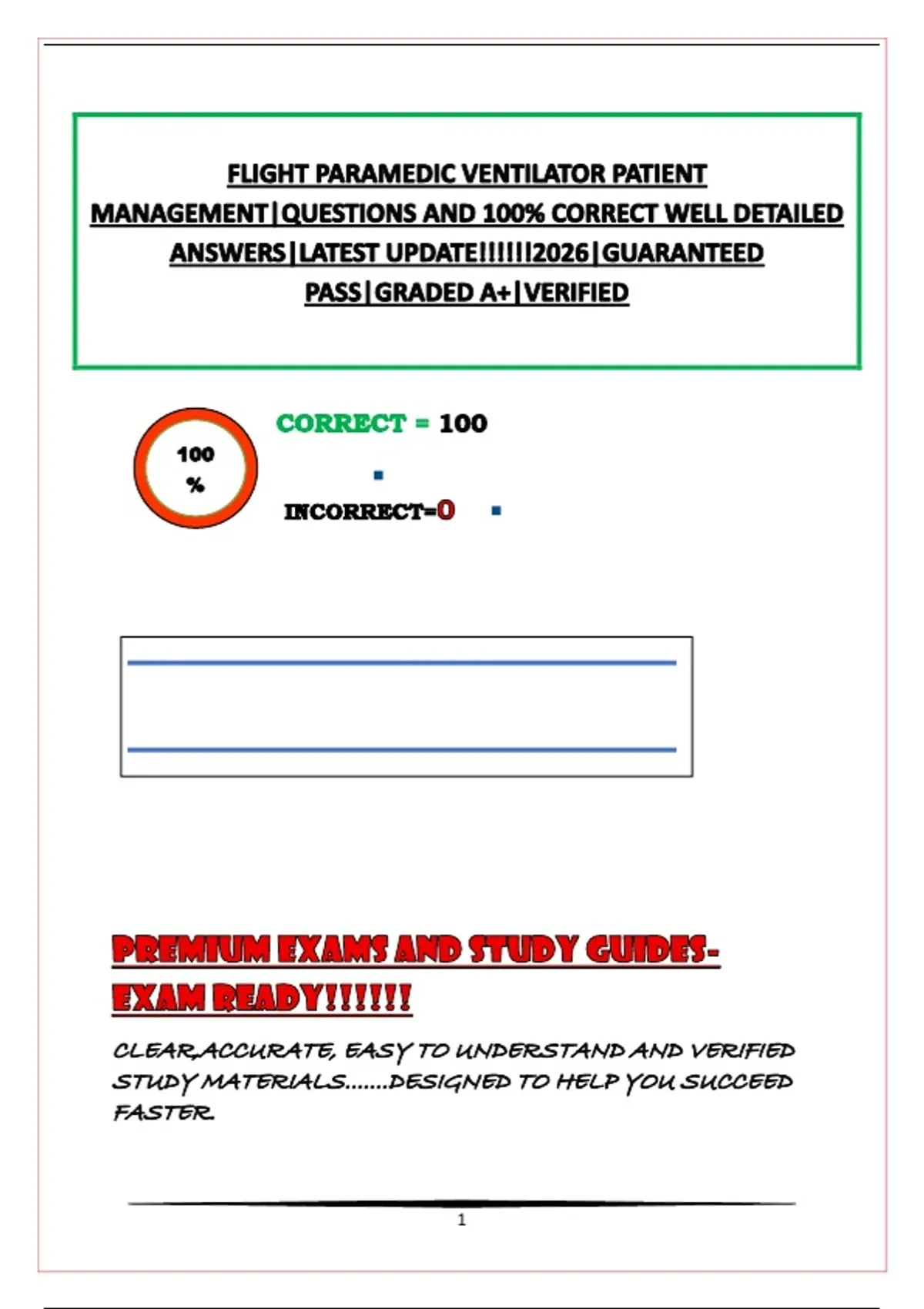FLIGHT PARAMEDIC VENTILATOR PATIENT MANAGEMENT|QUESTIONS AND 100% CORRECT WELL DETAILED ANSWERS|LATEST UPDATE!!!!!!2026|GUARANTEED PASS|GRADED A+|VERIFIED