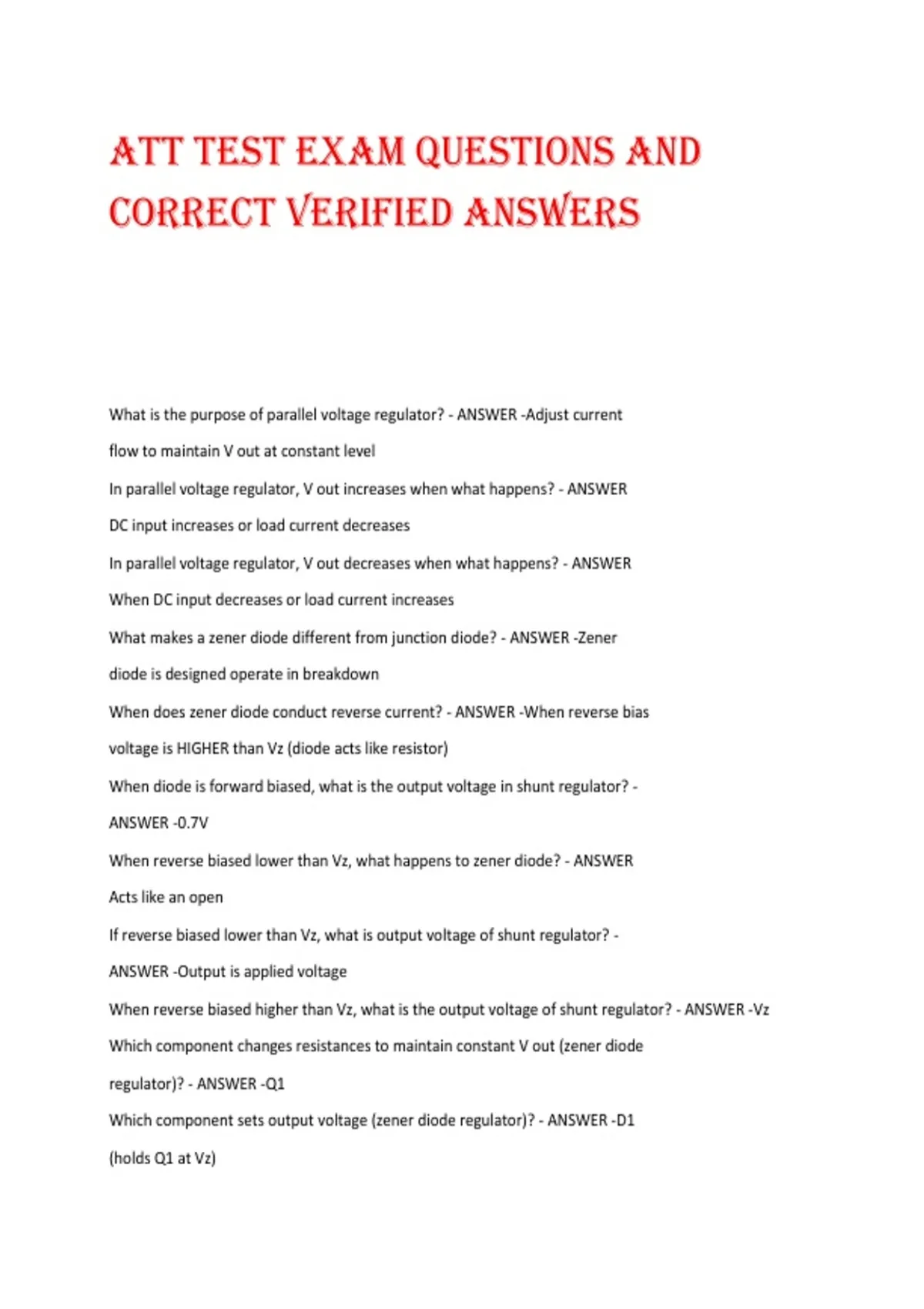 ATT Test EXAM Questions AND CORRECT VERIFIED ANSWERS What is the purpose of parallel voltage regulator? - ANSWER -Adjust current flow to maintain V out at constant level In parallel voltage regulator, V out increases when what happens? - ANSWER DC input increases or load current decreases In parallel voltage regulator, V out decreases when what happens? - ANSWER When DC input decreases or load current increases What makes a zener diode different from junction diode? - ANSWER -Zener diode is designed operate in breakdown When does zener diode conduct reverse current? - ANSWER -When reverse bias voltage is HIGHER than Vz (diode acts like resistor) When diode is forward biased, what is the output voltage in shunt regulator? - ANSWER -0.7V When reverse biased lower than Vz, what happens to zener diode? - ANSWER Acts like an open If reverse biased lower than Vz, what is output voltage of shunt regulator? - ANSWER -Output is applied voltage When reverse biased higher than Vz, what is the output voltage of shunt regulator? - ANSWER -Vz Which component changes resistances to maintain constant V out (zener diode regulator)? - ANSWER -Q1 Which component sets output voltage (zener diode regulator)? - ANSWER -D1 (holds Q1 at Vz) The voltage on emitter is established by what in zener diode regulator? - ANSWER -Action of Q1 If voltage increases what must happen to keep output voltage constant (zener diode regulator)? - ANSWER -Q1 collector-emitter resistance must increase If voltage decreases what must happen to keep output voltage constant (zener diode regulator)? - ANSWER -Q1 collector-emitter resistance must decrease In a voltage regulator, which component maintains a constant V out? - ANSWER -Q1 In a voltage regulator, which components set voltage? - ANSWER -D1 and Q2 What does R2 do in voltage regulator? - ANSWER -Varies conduction of Q2 (changes Vce) If input voltage increases in voltage regulator, Q2 must do what to maintain constant output? - ANSWER -Increase resistance to drop more voltage (voltage of Q2 increase) If input voltage decreases in voltage regulator, Q2 must do what to maintain constant output? - ANSWER -Decrease resistance to drop less voltage (voltage of Q2 decrease) If load current increases in voltage regulator, how is base to emitter biasing affected? - ANSWER -FB increases If load current decreases in voltage regulator, how is base to emitter biasing affected? - ANSWER -FB decreases If load current increases in voltage regulator what needs to be done to maintain constant output? - ANSWER -Decrease resistance to drop less voltage If load current increases in voltage regulator, what needs to be done to maintain constant output? - ANSWER -Decrease resistance to drop less volts What two conditions cause Vout to INCREASE in voltage regulator? - ANSWER -Input voltage increases or load current decreases What two conditions cause Vout to DECREASE in voltage regulator? - ANSWER -Input voltage decreases or load current increases What are the most common faults in voltage regulators? - ANSWER Semiconductor components (transistors/diodes) In a zener diode regulator, which faults cause output voltage to approach applied voltage? - ANSWER -D1 open, Short between Collector-Emitter In zener diode regulator, which faults cause output voltage to be 0V? - ANSWER -D1 short/R1 Open, open between Base-Emitter Which fault in zener diode regulation can damage diode? - ANSWER -R1 short How do you calculate base voltage of Q1 in voltage regulator? - ANSWER -Vz + Vce = Vb How type of components do filters use? - ANSWER -Reactive components What does a regulator do in a power supply? - ANSWER -maintains the output voltage at a constant level despite changes in load current What does the protection circuit do in power supply? - ANSWER -Prevents damage to power supply if load becomes faulty, limits or disables output The half wave rectifier is the same as what circuit? - ANSWER -Series limiter Which rectifier is the least efficient using only half the input? - ANSWER -Half wave Which two rectifiers require two input signals 180 degrees out of phase? - ANSWER -Full-wave and bridge Which rectifier uses a center tapped transformer? - ANSWER -Full wave How is frequency determined for half wave rectifier? - ANSWER -Output frequency is same as input frequency How is frequency determined for full wave rectifier? - ANSWER -Output is twice the input frequency How is frequency determined for bridge rectifier? - ANSWER -Output is twice the input frequency What is the purpose of series voltage regulators? - ANSWER -To adjust voltage drop to maintain V out at constant level In a series voltage regulator, V out INCREASES when what happens? - ANSWER -Load current decreases OR DC input increases
