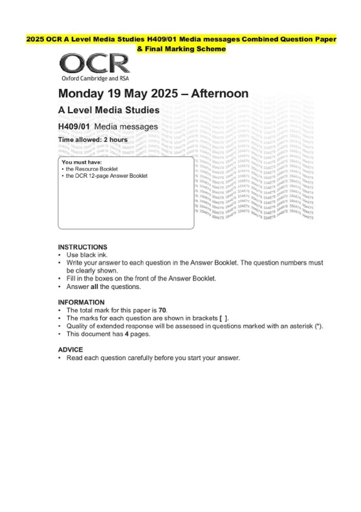 This document is a question paper for OCR A Level Media Studies (H409/01) – Media Messages, aligned with the 2025 specification. It contains exam-style questions intended to support familiarisation with the structure, format, and assessment focus of Paper H409/01. A final marking scheme is included, outlining how responses are assessed in line with OCR marking criteria. This resource is suitable for revision, exam practice, classroom use, and independent study.