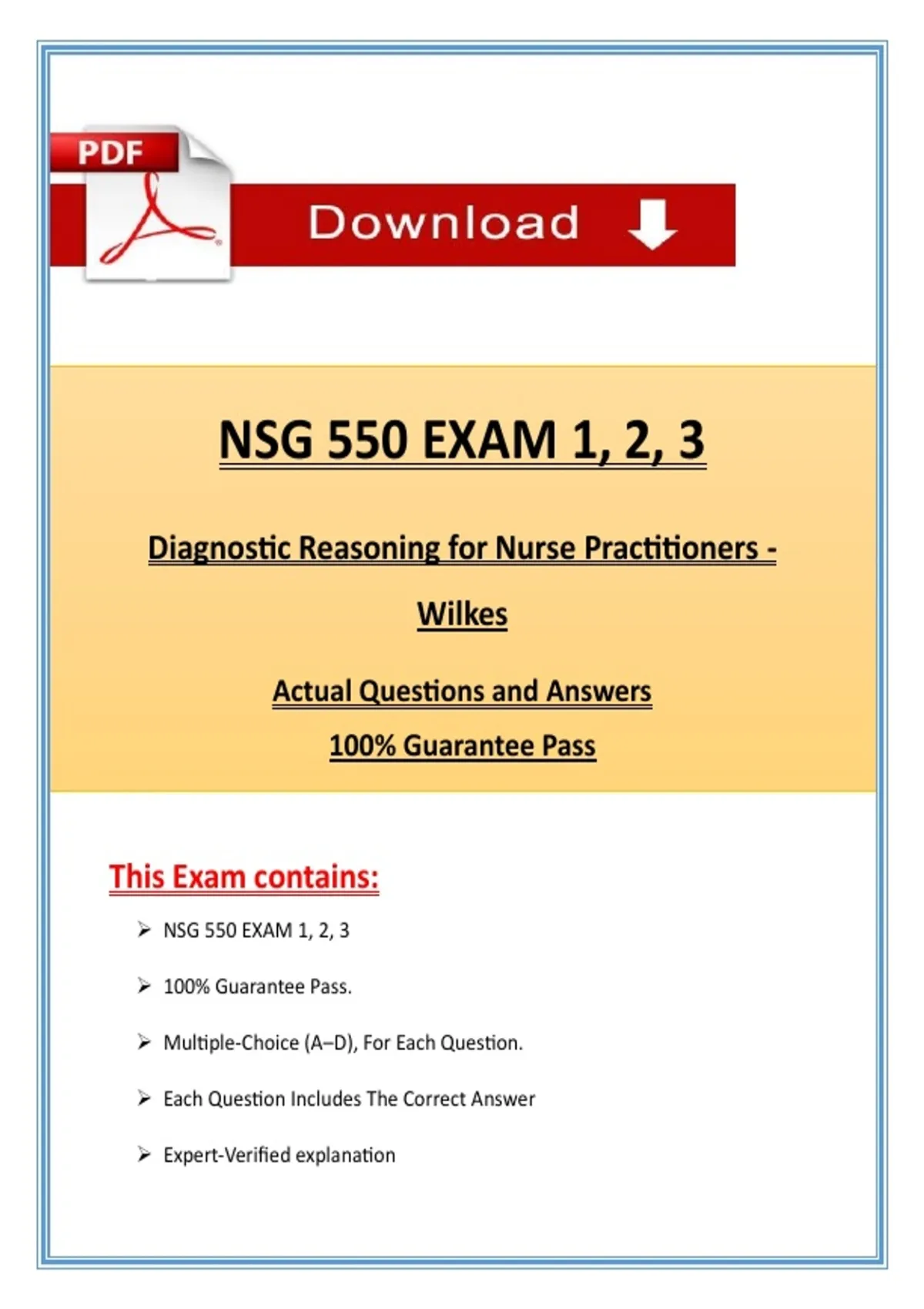 NSG 550 Exam 1, 2 & 3 | Diagnostic Reasoning – Wilkes | 2026 Verified Questions & Answers | PDF Succeed in NSG 550 Exams 1–3 – Diagnostic Reasoning for Nurse Practitioners at Wilkes University with this complete exam bundle, available as an Instant PDF Download. Designed for graduate nursing and nurse practitioner students, this resource includes diagnostic reasoning study guides, exam-style practice questions with verified answers, expert rationales, and clinical case-based learning. It strengthens clinical judgment, differential diagnosis skills, evidence-based decision-making, and patient-centered diagnostic reasoning across all three exams. Advanced health assessment interpretation Diagnostic reasoning & clinical decision-making Differential diagnosis & symptom analysis Lab, imaging & diagnostic test interpretation Red flag identification & urgent condition recognition Cardiovascular, respiratory & neurological case evaluation Endocrine & metabolic diagnostic reasoning Gastrointestinal & genitourinary assessment Mental health & behavioral symptom diagnostics Evidence-based clinical guidelines Case-based clinical scenarios & NP practice applications NSG 550 Exam 1 PDF NSG 550 Exam 2 PDF NSG 550 Exam 3 PDF Practice questions with verified answers Detailed explanations & clinical rationales Exam-focused summary notes Instant digital PDF download Printable & mobile-friendly format NSG 550 Exams 1–3 Diagnostic Reasoning Wilkes Wilkes University nursing Nurse practitioner diagnostics Graduate nursing NP prep NSG 550 practice questions Differential diagnosis nursing Clinical reasoning NP Lab interpretation nursing Advanced health assessment NP Evidence-based diagnosis Primary care diagnostics NP Cardiovascular diagnostic reasoning Neurological symptom analysis Endocrine diagnostic nursing Mental health diagnostic reasoning NP case studies PDF Wilkes nursing exam prep NSG 550 review guide Instant PDF nursing prep Graduate NP exams