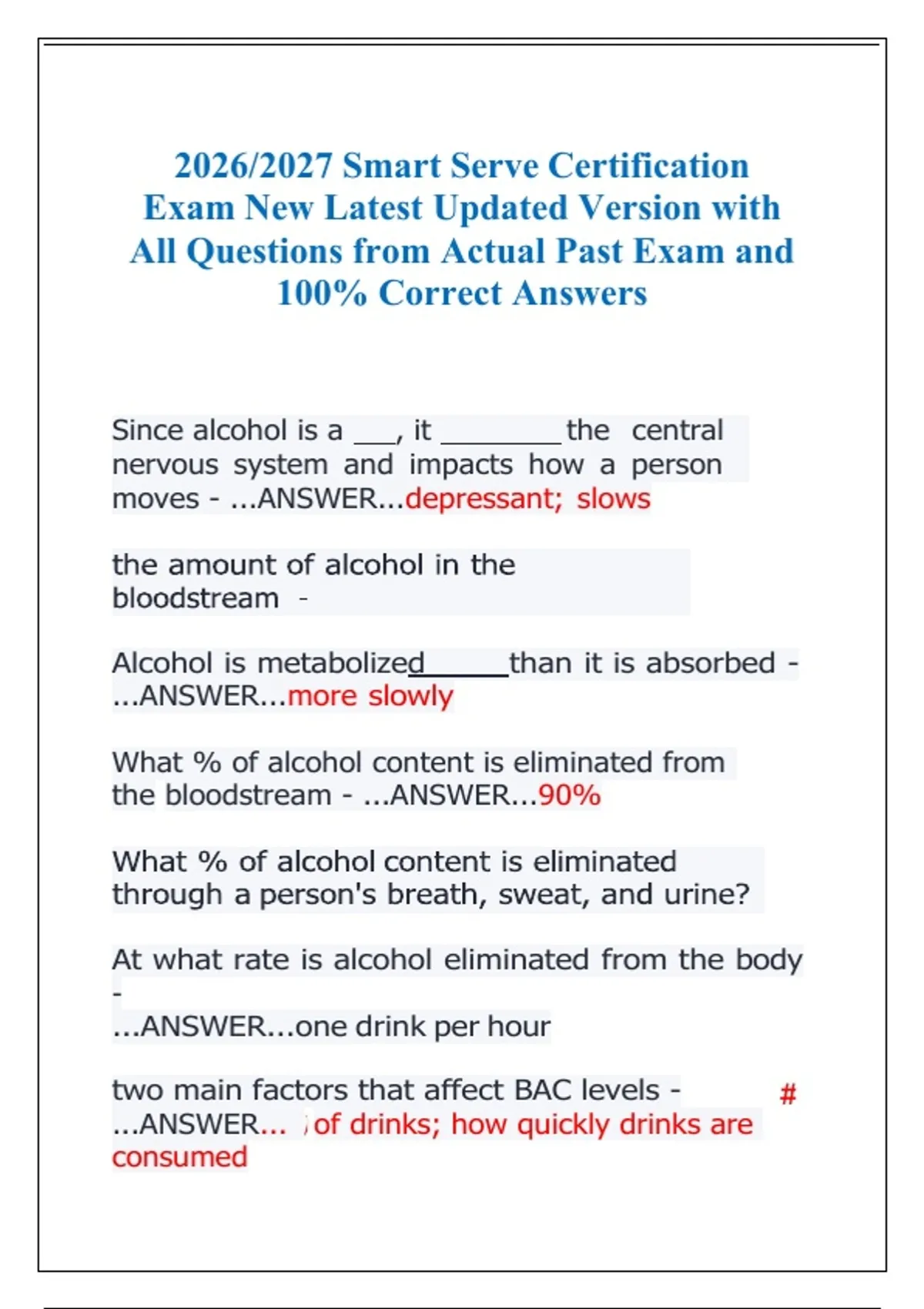 2026/2027 Smart Serve Certification Exam New Latest Updated Version with All Questions from Actual Past Exam and 100% Correct Answers