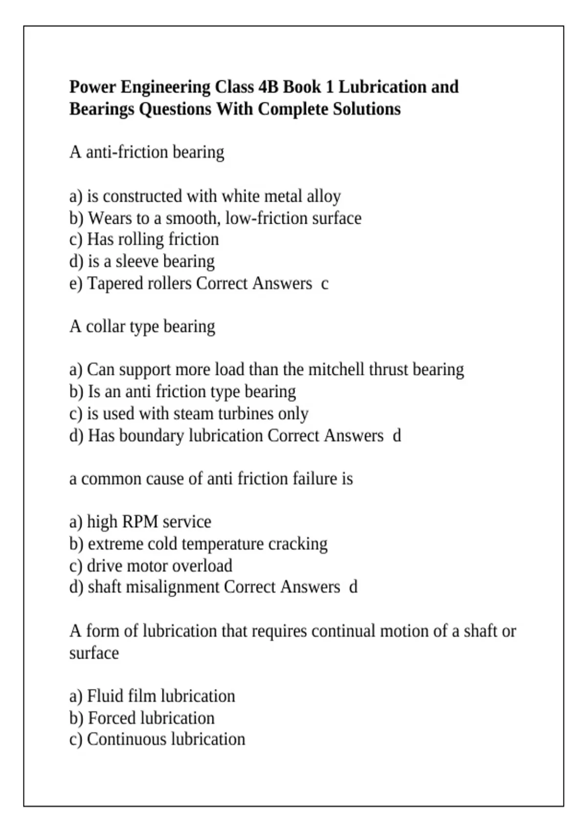 Power Engineering Class 4B Book 1 Lubrication and Bearings Questions With Complete Solutions