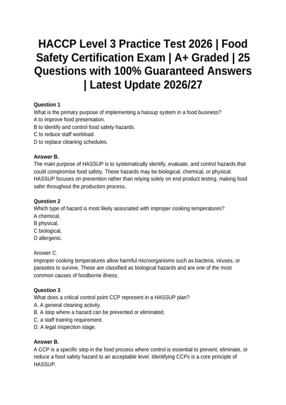 Prepare confidently for the HACCP Level 3 Food Safety Certification Exam with this 2026/2027 updated practice test. This document includes 25 exam-style questions with 100% guaranteed correct answers, graded A+, and aligned with the latest HACCP principles and food safety standards. Ideal for supervisors, managers, and professionals seeking reliable and up-to-date exam preparation.