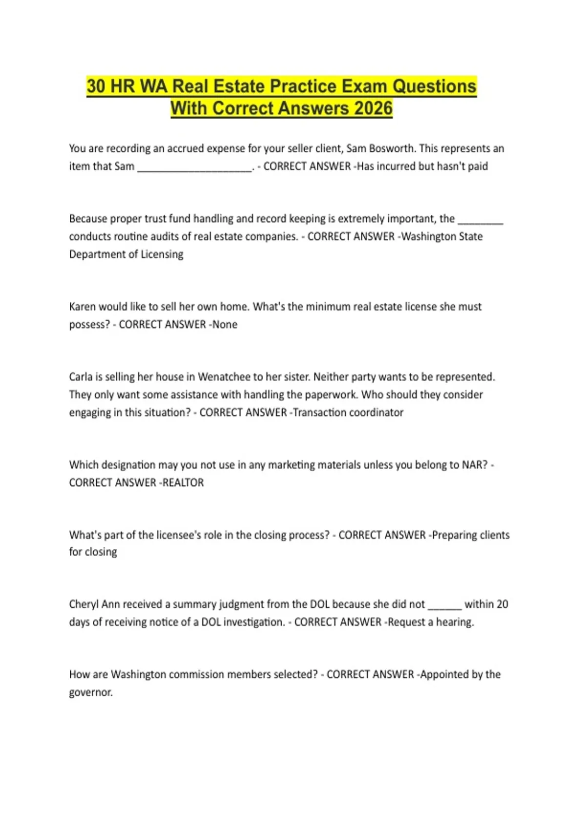 30 HR WA Real Estate Practice Exam Questions With Correct Answers 2026 30 HR WA Real Estate Practice Exam Questions With Correct Answers 2026