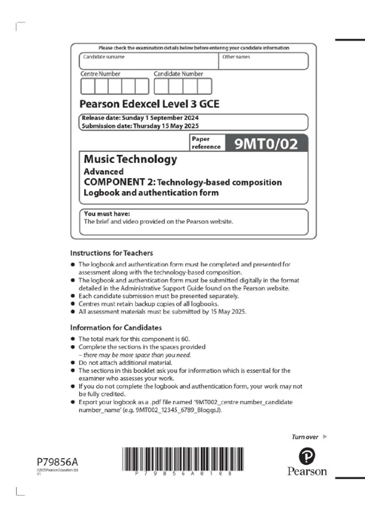 Pearson Edexcel Level 3 GCE Music Technology Advanced COMPONENT 2: Technology-based composition Logbook and authentication form MAY 2025 combined Question Paper and Mark scheme