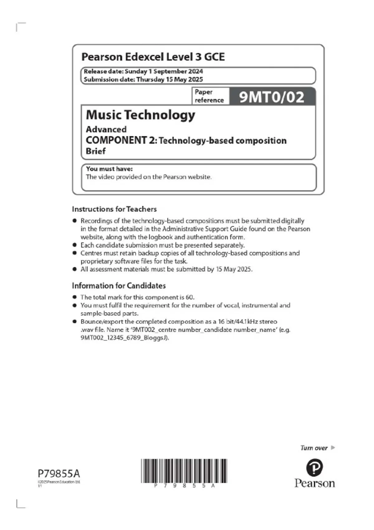 Pearson Edexcel Level 3 GCE Music Technology Advanced COMPONENT 2: Technology-based composition Brief MAY 2025 combined Question Paper and Mark scheme