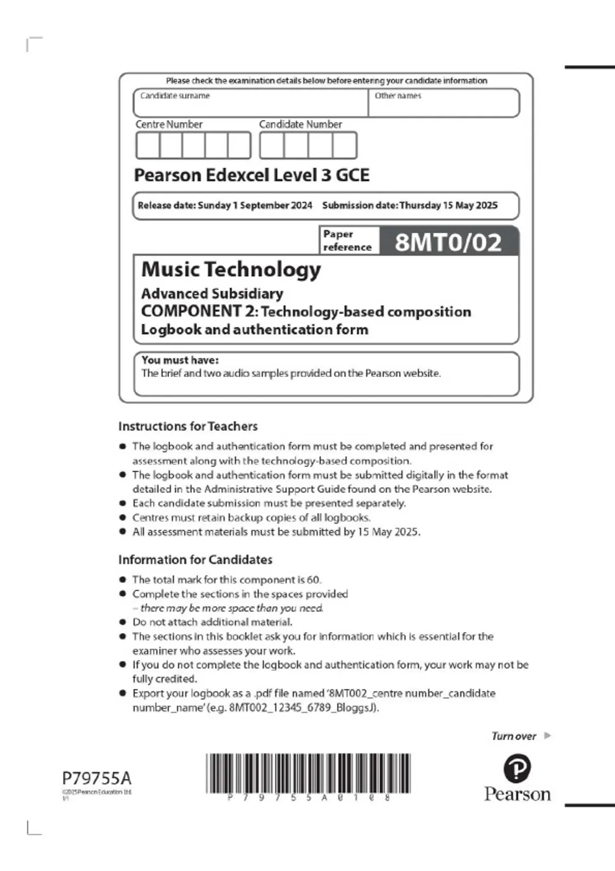Pearson Edexcel Level 3 GCE Music Technology Advanced Subsidiary COMPONENT 2: Technology-based composition Logbook and authentication form MAY 2025 combined Question Paper and Mark scheme