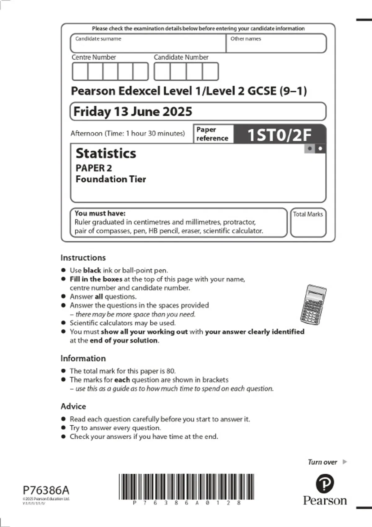 2025 Pearson Edexcel Level 1/Level 2 GCSE (9–1) Statistics PAPER 2 Foundation Tier Combined Question Paper and Marking Scheme