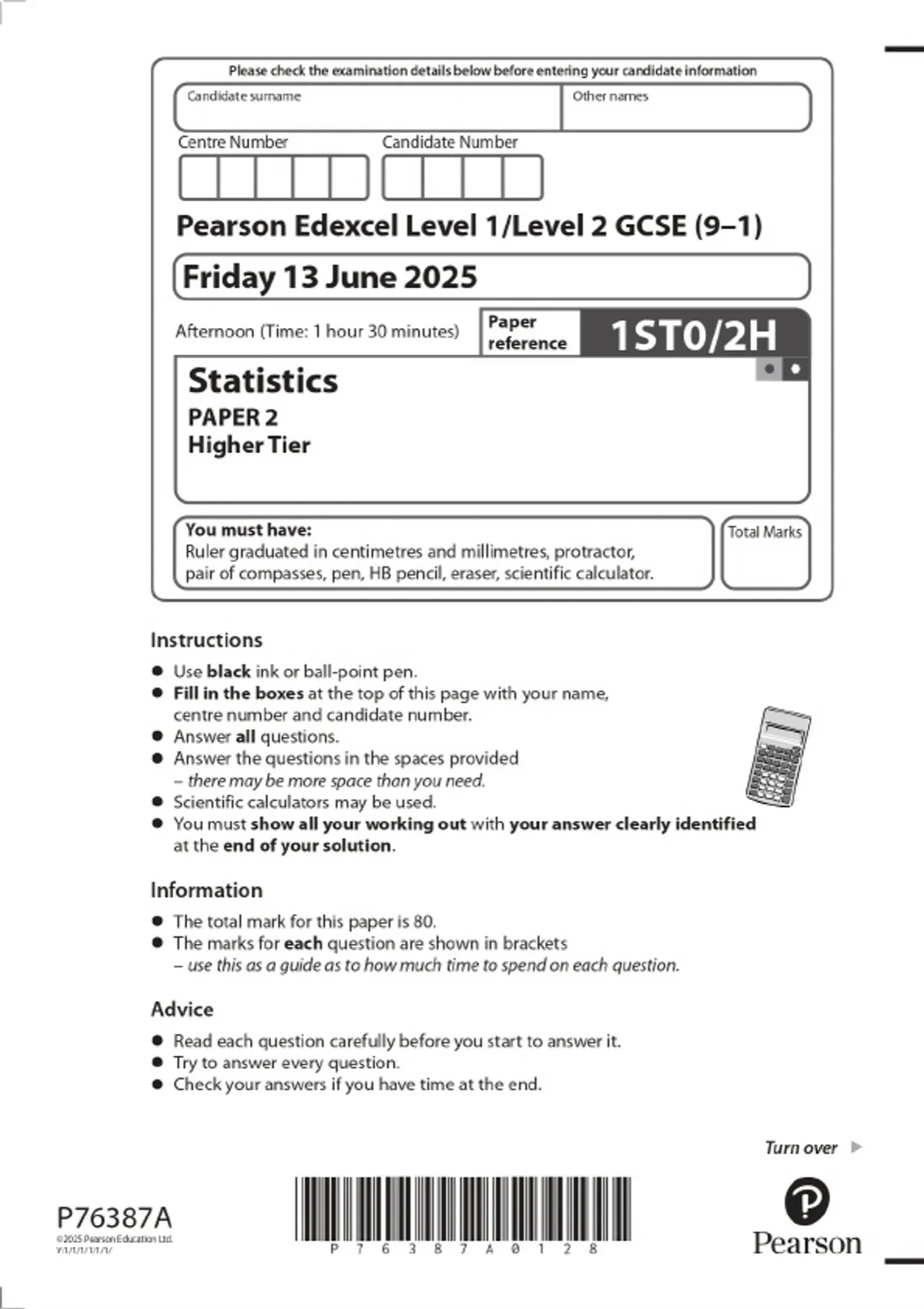 2025 Pearson Edexcel Level 1/Level 2 GCSE (9–1) Statistics PAPER 2 Higher Tier Combined Question Paper and Marking Scheme