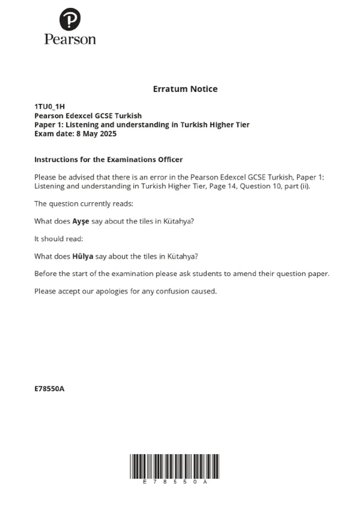 2025 Pearson Edexcel Level 1/Level 2 GCSE (9–1) Turkish PAPER 1: Listening and understanding in Turkish Foundation Tier Combined Question Paper and Marking Scheme