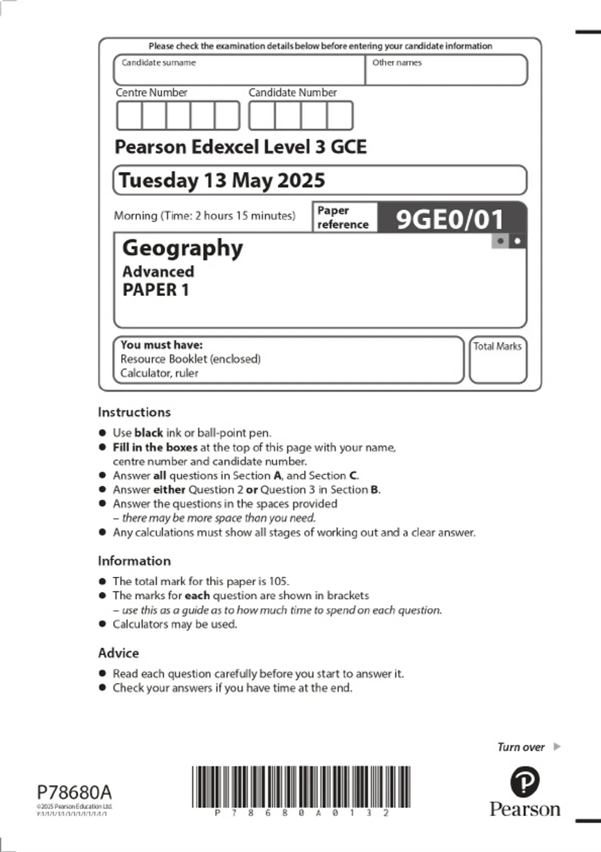 2025 pearson edexcel level 3 gce geography advance