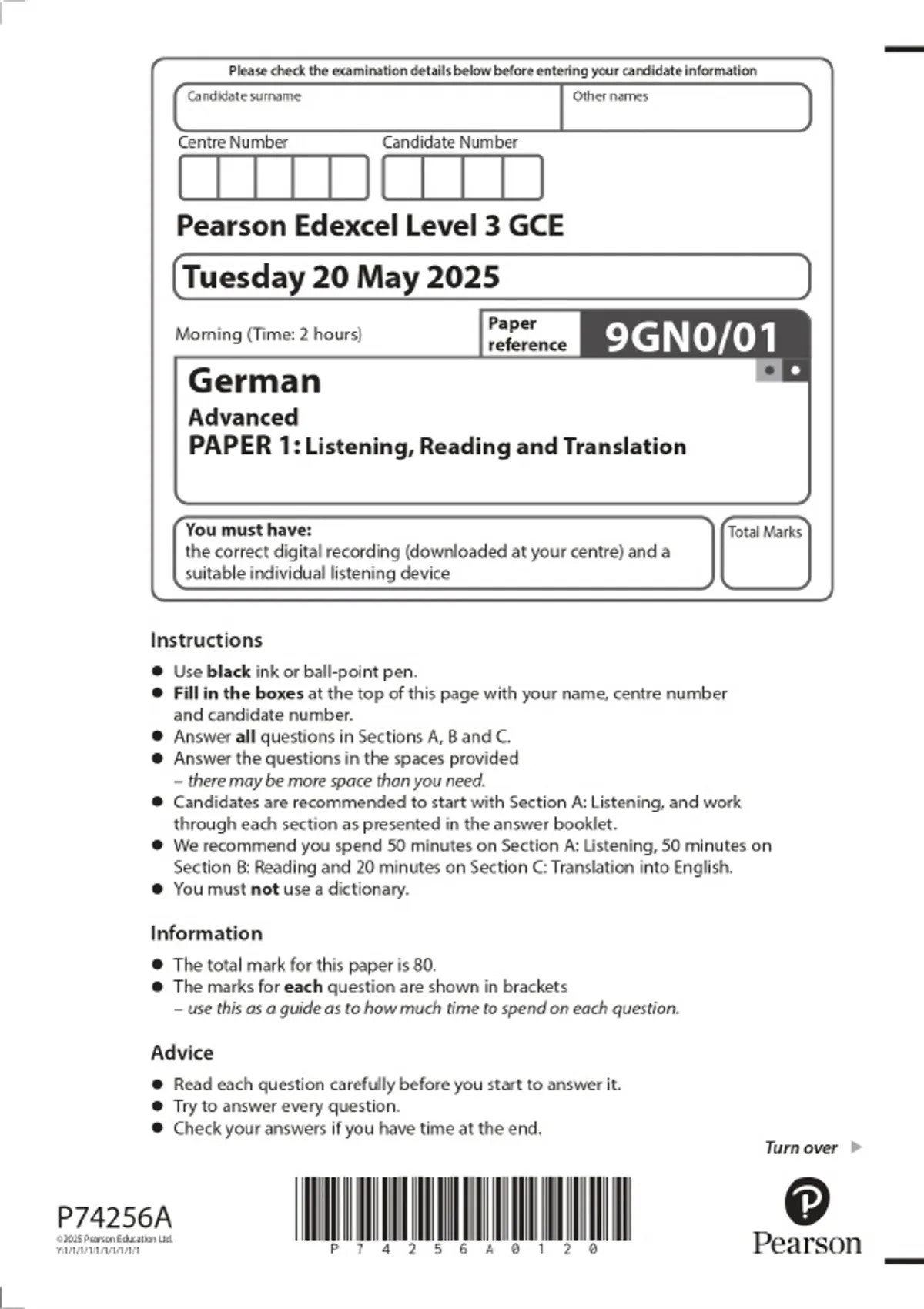 2025 Pearson Edexcel Level 3 GCE German Advanced PAPER 2: Written response to works and translation Combined Question Paper and Marking Scheme