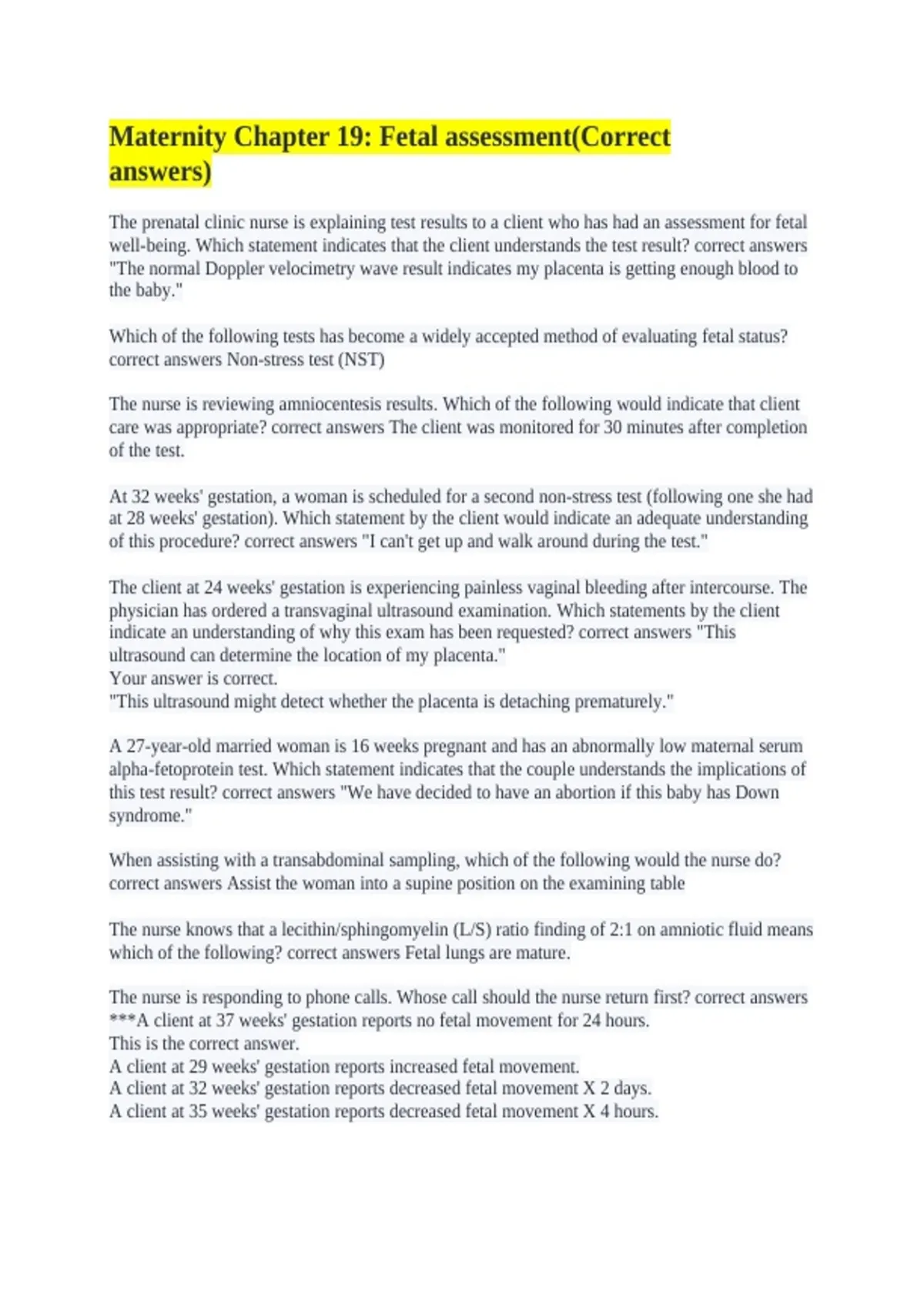 correct answers Non-stress test (NST)