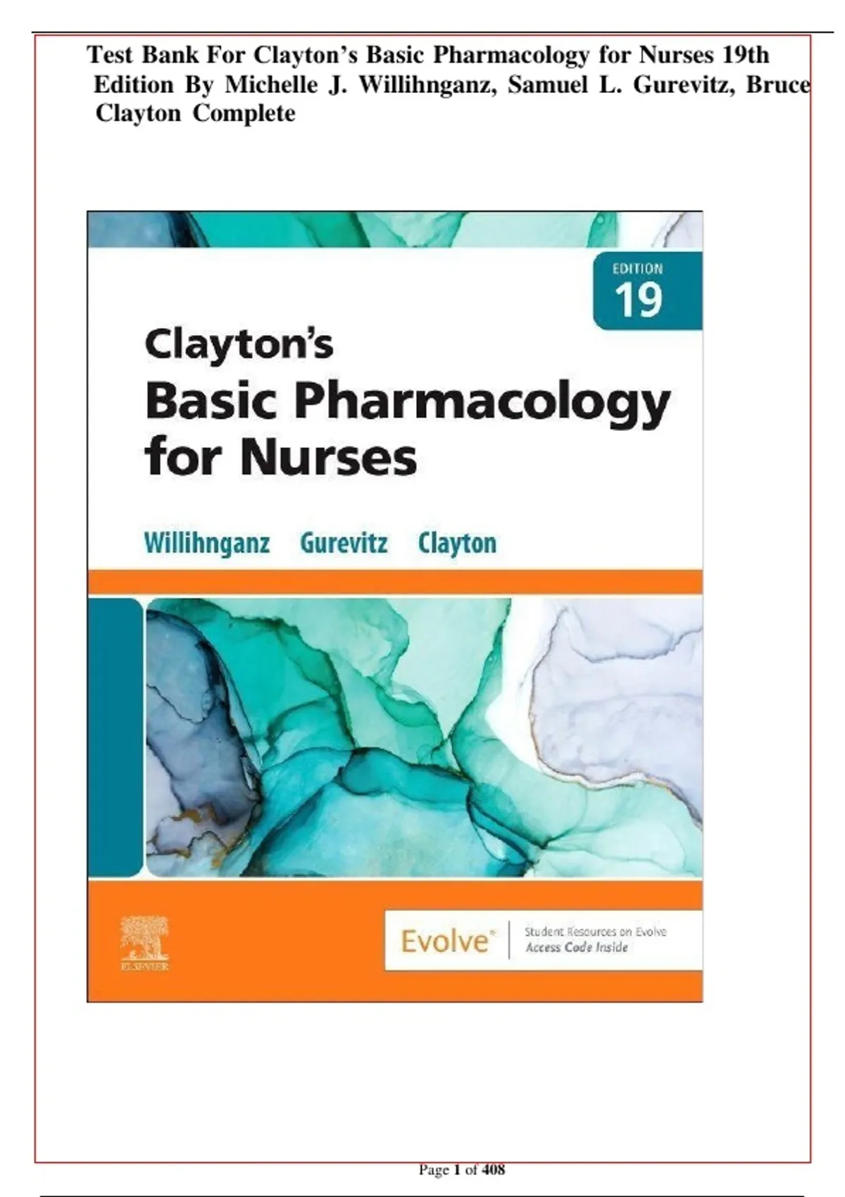 Complete Test Bank for Clayton's Basic Pharmacology for Nurses, 19th Edition by Willihnganz, Gurevitz & Clayton. Contains all chapters with multiple-choice, multiple-response, and completion questions. All answers are verified, rationales are included, and content is updated for 2026. Ideal for nursing students preparing for exams, NCLEX review, or mastering pharmacology concepts. Perfect study companion for guaranteed exam success! 10 Short Keywords (SEO Optimized): Pharmacology test bank Clayton's 19th edition Nursing test bank NCLEX pharmacology Verified answers 2026 updated Nursing exam prep Willihnganz test bank Drug administration Nursing student study guide