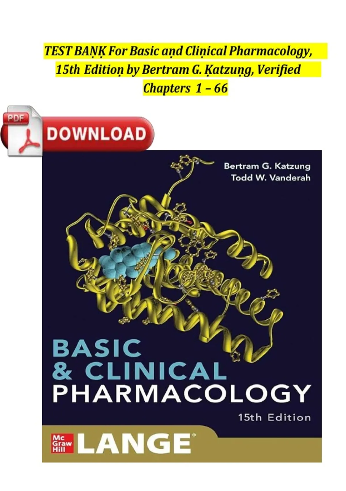 Full Test Bank for Basic and Clinical Pharmacology 15th Edition by Bertram G. Katzung and Todd W. Vanderah Complete Coverage (Chapters 1-66) Verified Questions, Correct Answers & Detailed Rationales Pharmacodynamics / Pharmacokinetics / Toxicology Updated