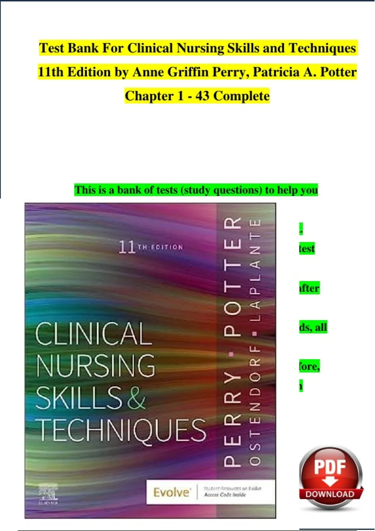 Test Bank For Clinical Nursing Skills and Techniques 11th Edition by Anne Griffin Perry, Patricia A. Potter Chapter 1 - 43 Complete