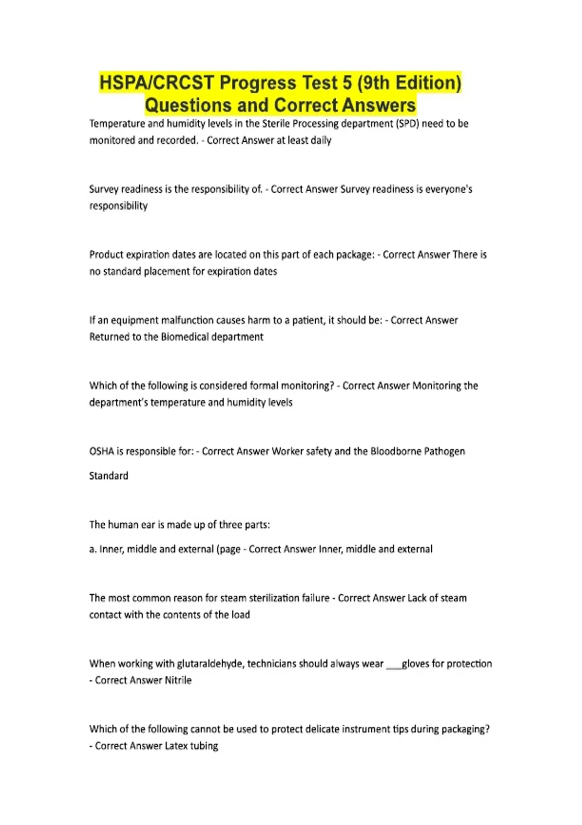 HSPA/CRCST Progress Test 5 (9th Edition) Questions and Correct Answers Temperature and humidity levels in the Sterile Processing department (SPD) need to be monitored and recorded. - Correct Answer at least daily Survey readiness is the responsibility of. - Correct Answer Survey readiness is everyone's responsibility Product expiration dates are located on this part of each package: - Correct Answer There is no standard placement for expiration dates If an equipment malfunction causes harm to a patient, it should be: - Correct Answer Returned to the Biomedical department Which of the following is considered formal monitoring? - Correct Answer Monitoring the department's temperature and humidity levels OSHA is responsible for: - Correct Answer Worker safety and the Bloodborne Pathogen Standard The human ear is made up of three parts: a. Inner, middle and external (page - Correct Answer Inner, middle and external The most common reason for steam sterilization failure - Correct Answer Lack of steam contact with the contents of the load When working with glutaraldehyde, technicians should always wear ___gloves for protection - Correct Answer Nitrile Which of the following cannot be used to protect delicate instrument tips during packaging? - Correct Answer Latex tubing