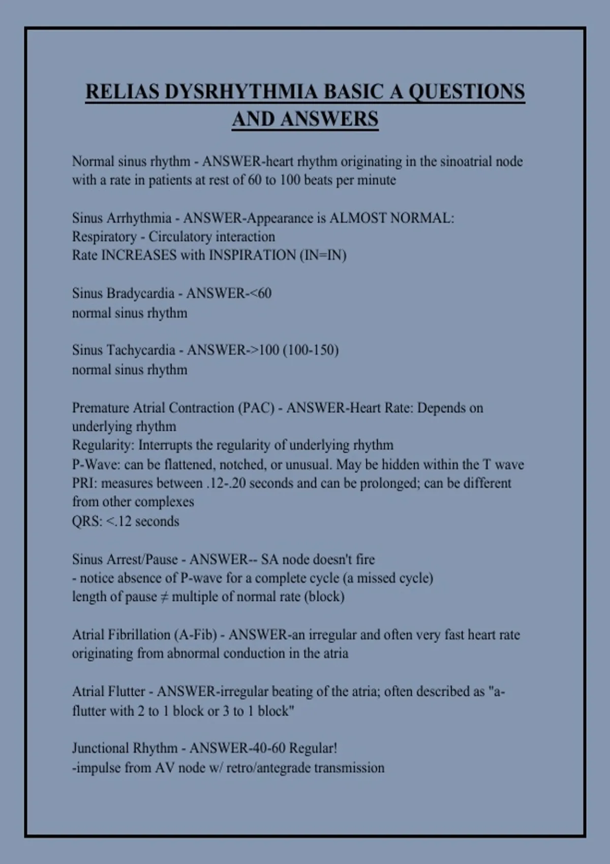 Validated competency in cardiac rhythm interpretation through the Relias Dysrhythmia examination, demonstrating proficiency in identifying atrial, ventricular, junctional, and heart block rhythms, as well as analyzing EKG strip components to ensure patient safety and timely intervention." Successfully completed the comprehensive Relias Dysrhythmia course, focusing on the systematic interpretation of cardiac arrhythmias, measurement of intervals, and identification of lethal rhythms in accordance with clinical standards." Normal sinus rhythm - ANSWER-heart rhythm originating in the sinoatrial node with a rate in patients at rest of 60 to 100 beats per minute Sinus Arrhythmia - ANSWER-Appearance is ALMOST NORMAL: Respiratory - Circulatory interaction Rate INCREASES with INSPIRATION (IN=IN) Sinus Bradycardia - ANSWER-60 normal sinus rhythm Sinus Tachycardia - ANSWER-100 (100-150) normal sinus rhythm Premature Atrial Contraction (PAC) - ANSWER-Heart Rate: Depends on underlying rhythm Regularity: Interrupts the regularity of underlying rhythm P-Wave: can be flattened, notched, or unusual. May be hidden within the T wave PRI: measures between .12-.20 seconds and can be prolonged; can be different from other complexes QRS: .12 seconds Sinus Arrest/Pause - ANSWER-- SA node doesn't fire - notice absence of P-wave for a complete cycle (a missed cycle) length of pause ≠ multiple of normal rate (block) Atrial Fibrillation (A-Fib) - ANSWER-an irregular and often very fast heart rate originating from abnormal conduction in the atria Atrial Flutter - ANSWER-irregular beating of the atria; often described as "a-flutter with 2 to 1 block or 3 to 1 block" Junctional Rhythm - ANSWER-40-60 Regular! -impulse from AV node w/ retro/antegrade transmission