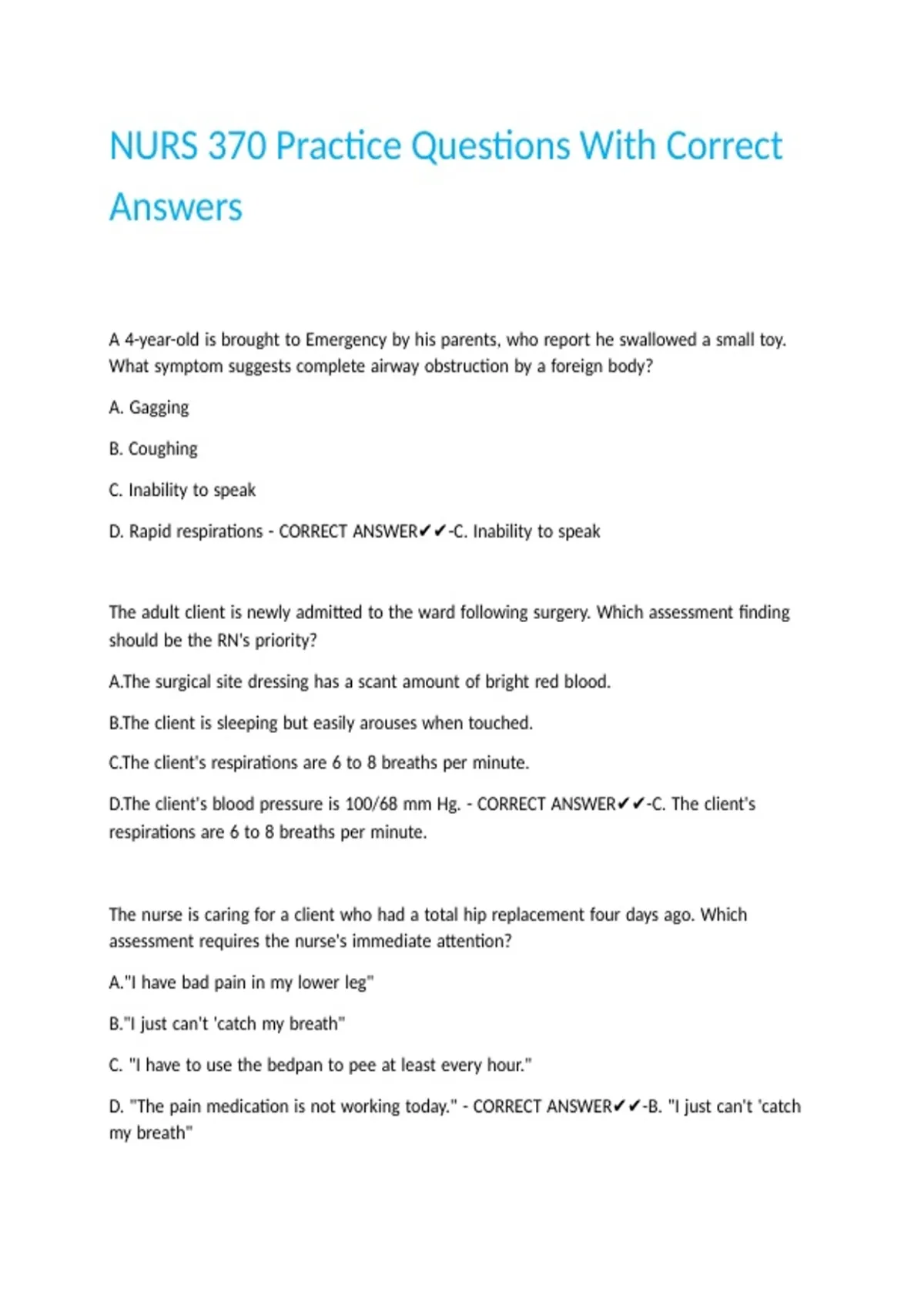 NURS 370 Practice Questions With Correct