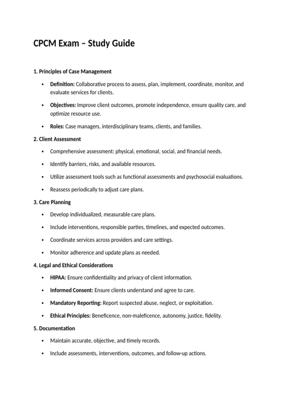 This study guide is designed to help candidates prepare for the CPCM (Certified Professional Case Manager) Exam. It covers core topics in professional case management, including client assessment, care planning, coordination of services, legal and ethical considerations, documentation, communication, and quality improvement. Practice questions are included to reinforce learning and exam readiness.